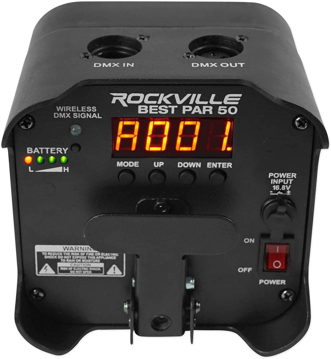 Package Includes: (10) RockvilIe BEST PAR 50 Rechargeable Par Can Wash Light w/ Wireless DMX+RGBWA+UV. (1) RockvilIe ROCKFORCE W2 192 Channel Wireless 2.4Ghz DMX Lighting Controller. RockvilIe BEST PAR 50 Rechargeable Par Can Wash Light w/ Wireless DMX+RGBWA+UV. 100% true wireless! Built in 2.4GHZ Wireless DMX 512 receiver allows you to link multiple lights together without wires