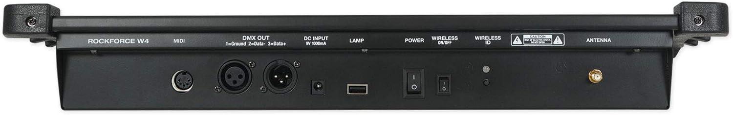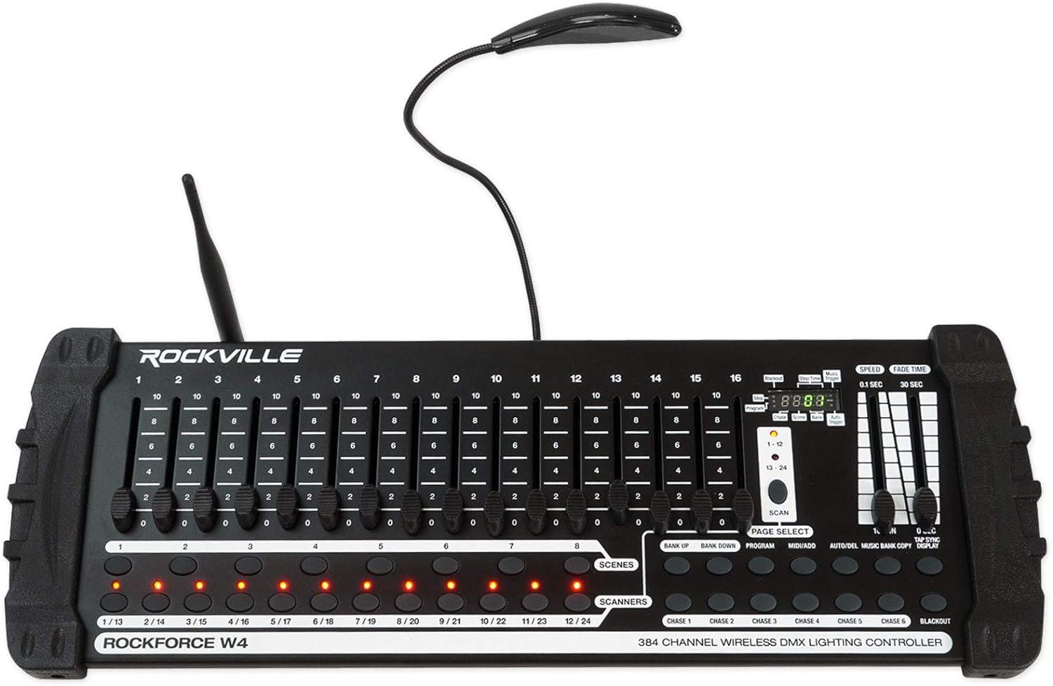 Unit Weight: 4.6 lbs. Lighting controller. USB LED Light. Power Adapter (DC 9-12V 500mA,90V~240V). Wireless transmitter antenna. Manual and warranty card. RockvilIe ROCKFORCE W4 384 Channel Wireless DMX Lighting Controller+MIDI Controls. Built in wireless DMX transmitter and antenna. Model DMX-WRE receiver available in our store (DMX receiver compatible with this). Compatible with all RockvilIe wireless DMX lights. Compatible with wireless DMX lights made by Chauvet, American DJ, and more!