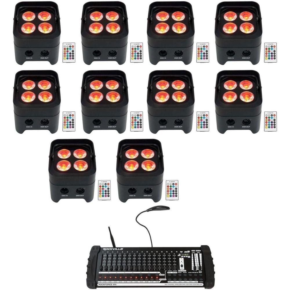 Package Includes: (10) RockvilIe BEST PAR 50 Rechargeable Par Can Wash Light w/ Wireless DMX+RGBWA+UV. (1) RockvilIe ROCKFORCE W4 384 Channel Wireless DMX Lighting Light Controller+MIDI. RockvilIe BEST PAR 50 Rechargeable Par Can Wash Light w/ Wireless DMX+RGBWA+UV. 100% true wireless! Built in 2.4GHZ Wireless DMX 512 receiver allows you to link multiple lights together without wires