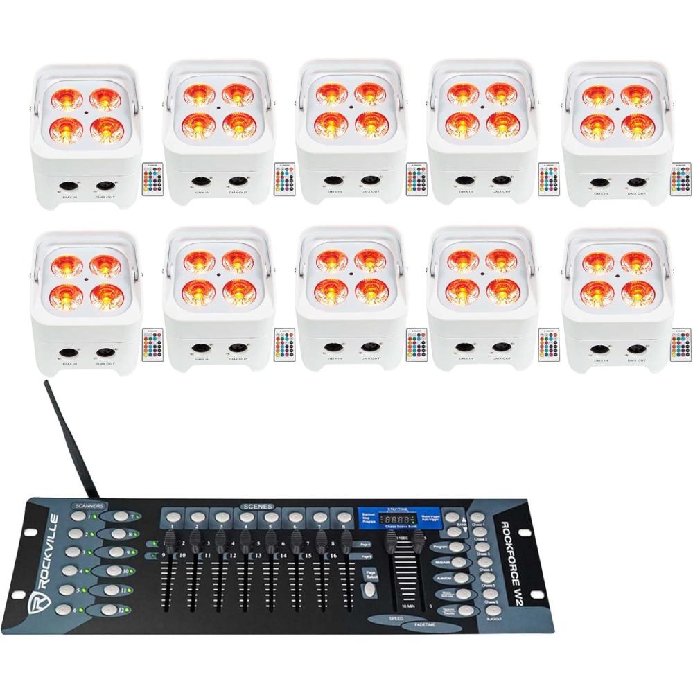 Package Includes: (10) RockvilIe BEST PAR 50 White Rechargeable Par Wash Up-Light Wireless DMX+RGBWA+UV. (1) RockvilIe ROCKFORCE W2 192 Channel Wireless 2.4Ghz DMX Lighting Controller. Features of BEST PAR 50 White: RockvilIe BEST PAR 50 White Rechargeable Par Can Wash Light w/ Wireless DMX+RGBWA+UV. 100% true wireless! Built in 2.4GHZ Wireless DMX 512 receiver allows you to link multiple lights together without wires
