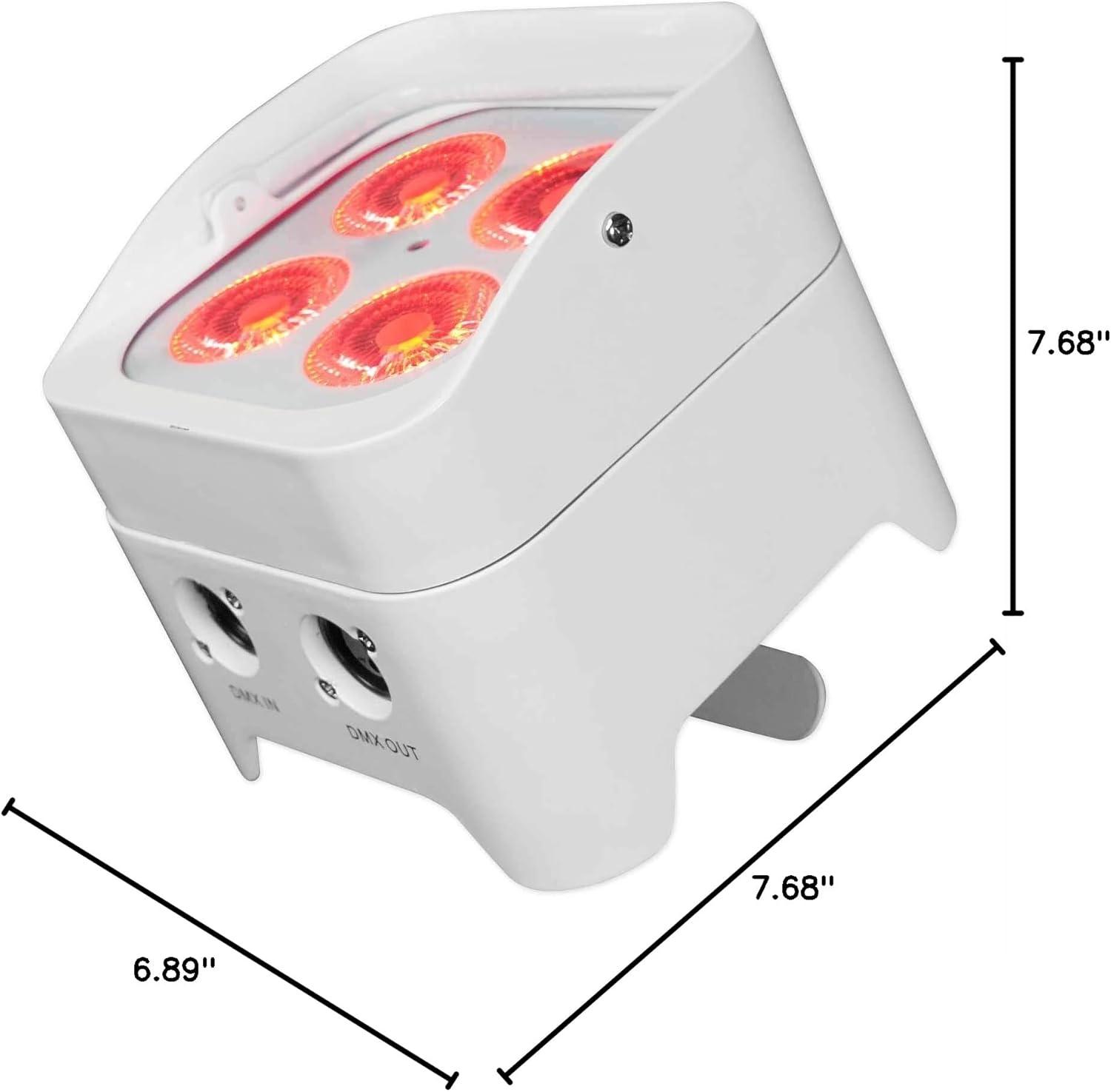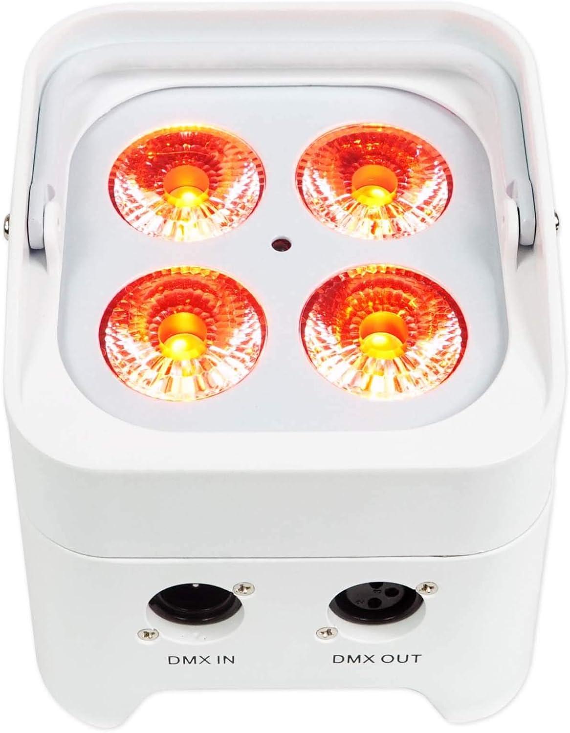 Built in rechargeable battery allows you to use the lights without plugging them in making your setup 100% wireless. Light Source: 4 LEDs / 6 Watts each LED. Each LED is a 6-in-1 RGBWA+UV (RED, GREEN, BLUE, WHITE, AMBER + ULTRA VIOLET). DMX control: 6 or 10 channels. DMX input and output (3 pin). 50,000 hours life expectancy. IRC wireless remote control included
