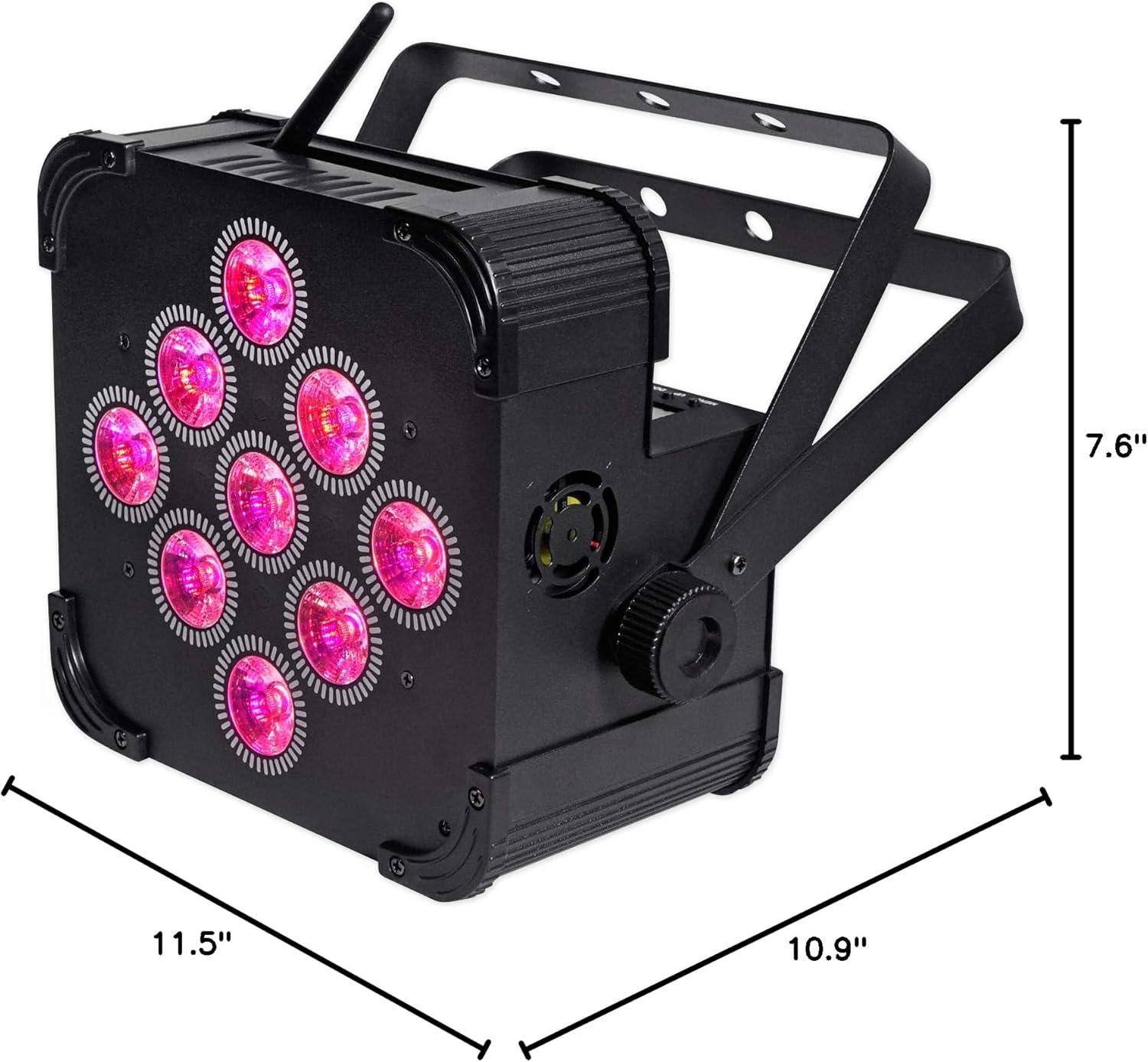 Built in rechargeable battery allows you to use the lights without plugging them in making your setup 100% wireless. Light Source: 9 LEDs / 6 Watts each LED. Each LED is a 6-in-1 RGBWA+UV (RED, GREEN, BLUE, WHITE, AMBER + ULTRA VIOLET). DMX control: 6 or 10 channels. DMX input and output (3 pin). 50,000 hours life expectancy. IRC wireless remote control included. Super bright: 4350 lux @1m (way brighter than others on the market)