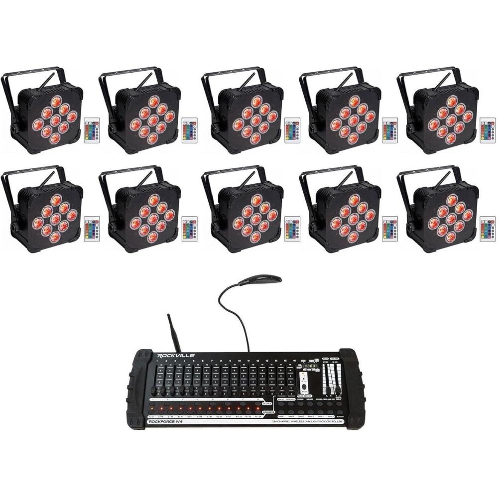 Package Includes: (10) RockvilIe BEST PAR 60 Rechargeable Par Can Wash Light w/ Wireless DMX+RGBWA+UV. (1) RockvilIe ROCKFORCE W4 384 Channel Wireless DMX Lighting Light Controller+MIDI. Par Light. Remote control. Dual bracket. Power cable (5 feet). User manual and warranty card. RockvilIe BEST PAR 60 Rechargeable Battery Powered Slim Par Wash Light. 100% true wireless! Built in 2.4GHZ Wireless DMX 512 receiver allows you to link multiple lights together without wires