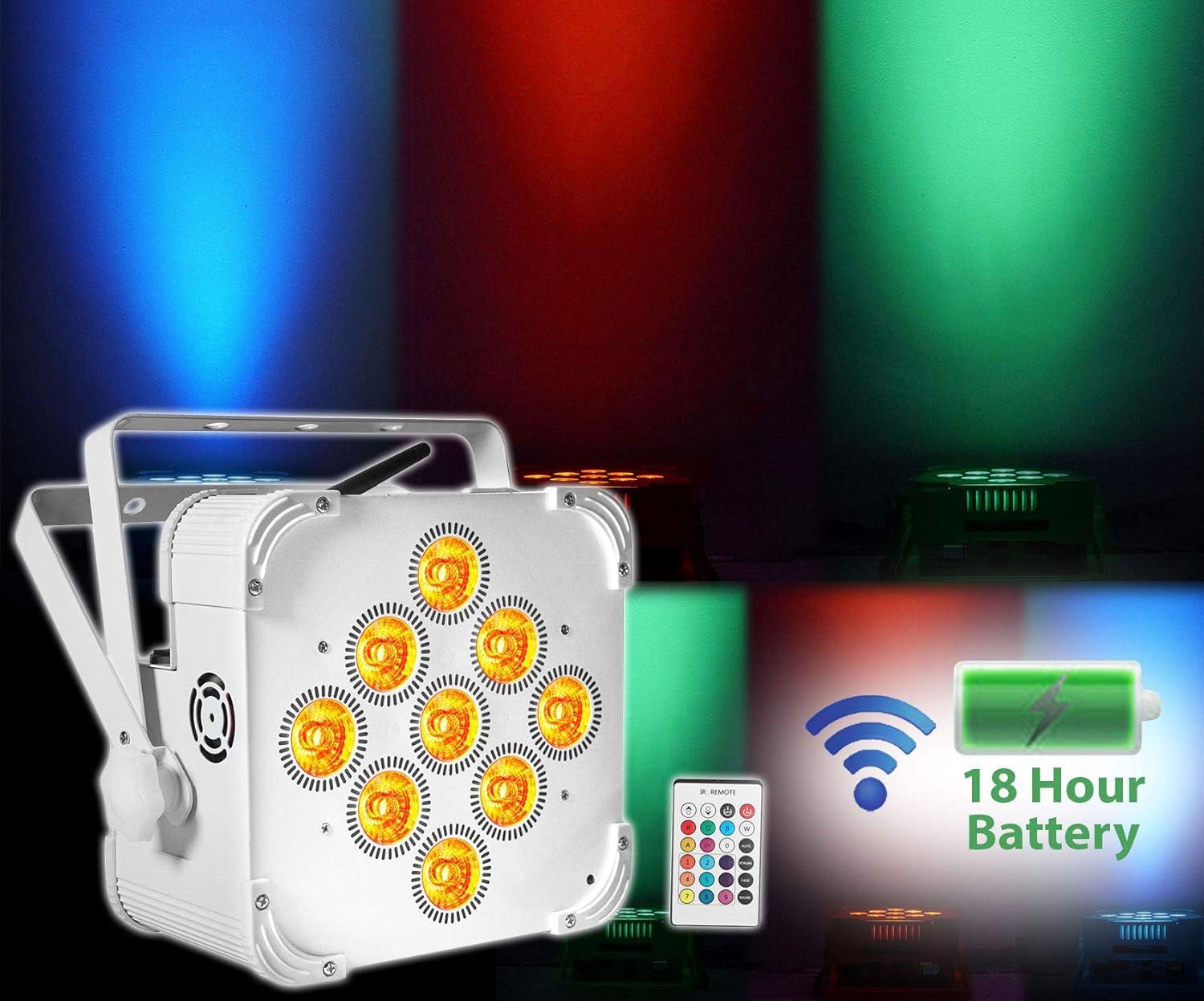 Built in rechargeable battery allows you to use the lights without plugging them in making your setup 100% wireless. Light Source: 9 LEDs / 6 Watts each LED. Each LED is a 6-in-1 RGBWA+UV (RED, GREEN, BLUE, WHITE, AMBER + ULTRA VIOLET). DMX control: 6 or 10 channels. DMX input and output (3 pin). 50,000 hours life expectancy. IRC wireless remote control included. Super bright: 6500 lux @1m (way brighter than others on the market)