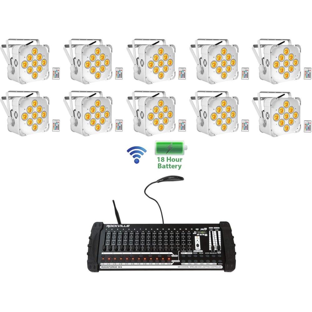 Package Includes: (10) RockvilIe BEST PAR 60 White RGBWA+UV Battery Powered Wireless DMX Wash Par Light. (1) RockvilIe ROCKFORCE W4 384 Channel Wireless DMX Lighting Light Controller+MIDI. Par Light. Remote control. Dual bracket. Power cable (5 feet). User manual and warranty card. RockvilIe BEST PAR 60 White RGBWA+UV Battery Powered Wireless DMX Wash Par Light. 100% true wireless! Built in 2.4GHZ Wireless DMX 512 receiver allows you to link multiple lights together without wires
