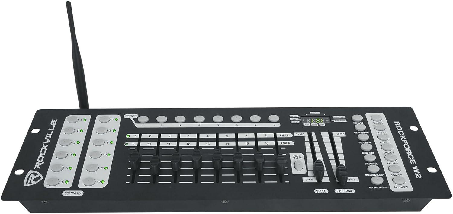 Field replaceable batteries. 110/220 switchable for use in any country. Unit Dimensions: 22 x 6.89 x 5.12 inches. Unit Weight: 9.37 Lbs. Includes: Lighting controller. Power cable. Wireless transmitter antenna. Manual and warranty card. Features: RockvilIe ROCKFORCE W2 192 Channel Light/Fog DMX Lighting Controller With Built In Wireless DMX Transmitter. Built in wireless DMX transmitter and antenna. Model DMX-WRE receiver available in our store is a DMX receiver compatible with this