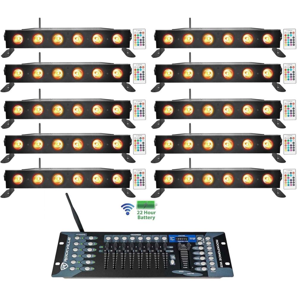 Package Includes: (10) RockvilIe BEST STRIP 60 Black Rechargeable Wash Light Bars/Wireless DMX+RGBWA+UV. (1) RockvilIe ROCKFORCE W2 192 Channel Wireless 2.4Ghz DMX Lighting Controller. Best Strip Light. Remote control. Dual bracket & Feet. Power cable (5 ft.). User manual and warranty card. RockvilIe Best Strip 60 Rechargeable Battery Powered Strip Wash Light. 100% true wireless! Built in 2.4GHZ Wireless DMX 512 receiver allows you to link multiple lights together without wires