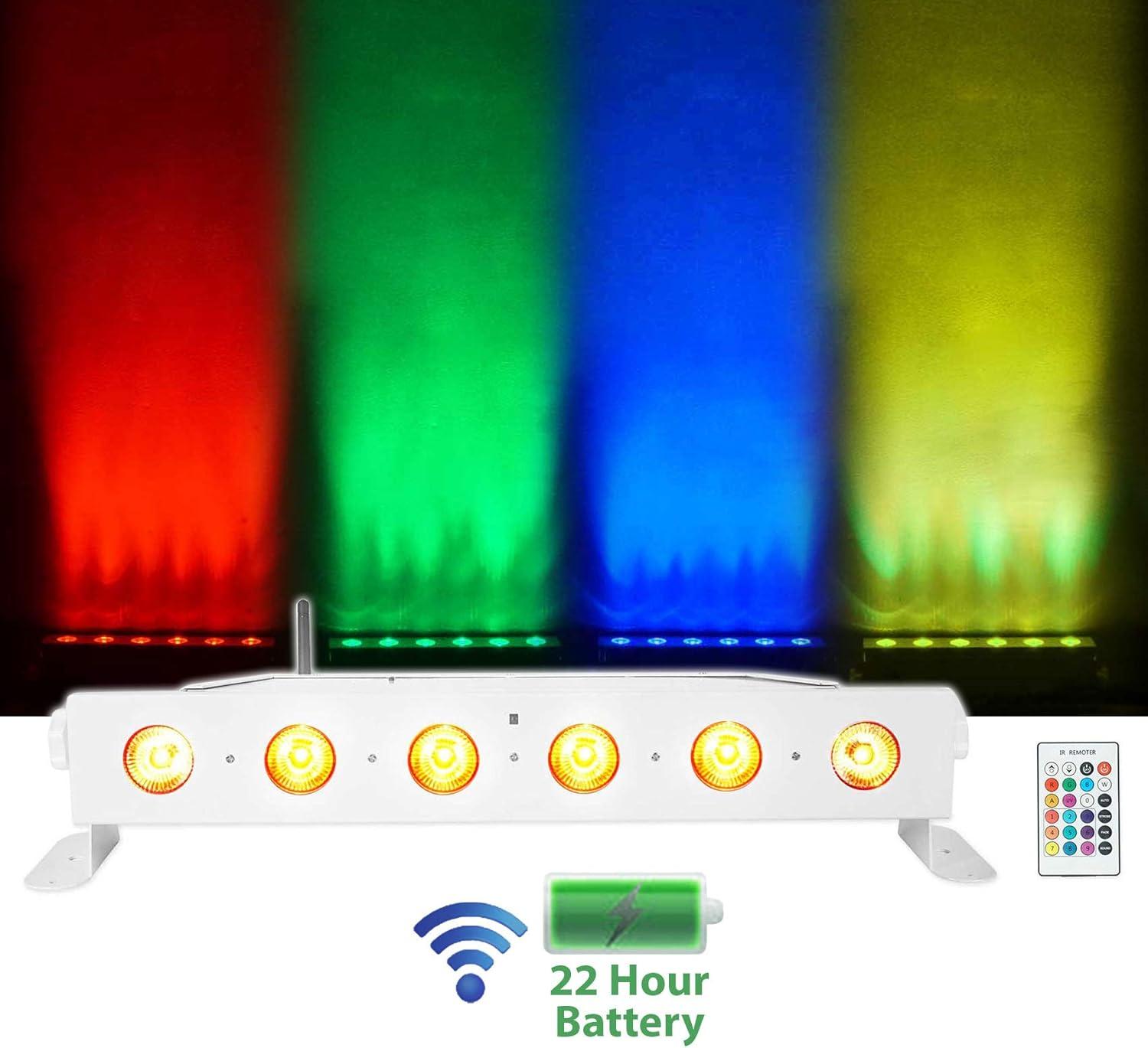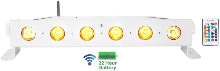 Built in rechargeable battery allows you to use the lights without plugging them in making your setup 100% wireless. Light Source: 6 LEDs / 6 Watts each LED. Each LED is a 6-in-1 RGBWA+UV (RED, GREEN, BLUE, WHITE, AMBER + ULTRA VIOLET). DMX control: 6 or 10 channels. DMX input and output (3 pin). 50,000 hours life expectancy. IRC wireless remote control included. Super bright: 6500 lux @1m (way brighter than others on the market)
