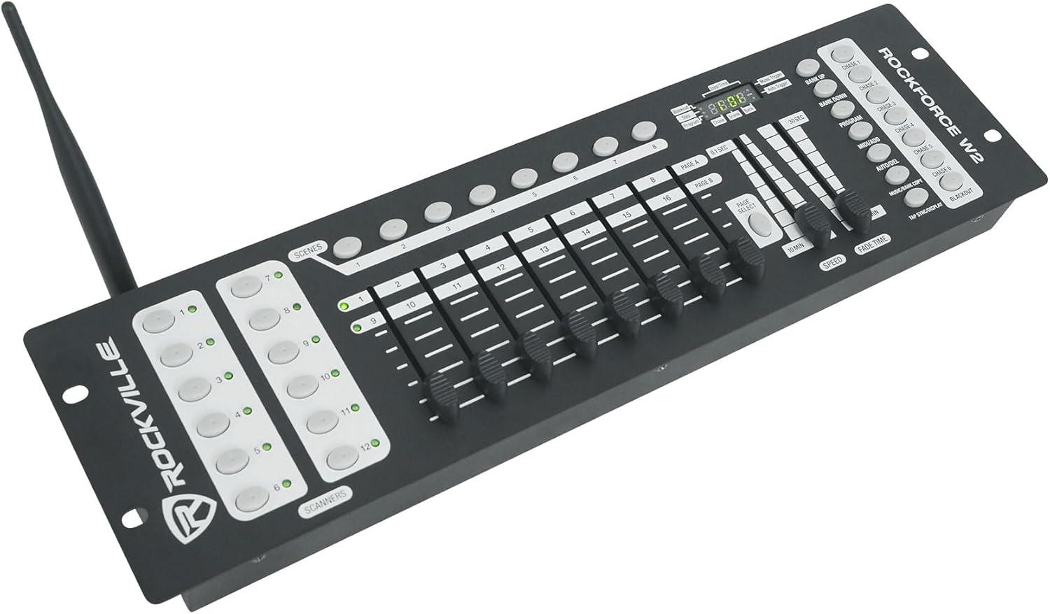 Field replaceable batteries. 110/220 switchable for use in any country. Unit Dimensions: 22×6.89×5.12 inches. Unit Weight: 9.37 Lbs. Includes: Lighting controller. Power cable. Wireless transmitter antenna. Manual and warranty card. Features: RockvilIe ROCKFORCE W2 192 Channel Light/Fog DMX Lighting Controller With Built In Wireless DMX Transmitter. Built in wireless DMX transmitter and antenna. Model DMX-WRE receiver available in our store is a DMX receiver compatible with this