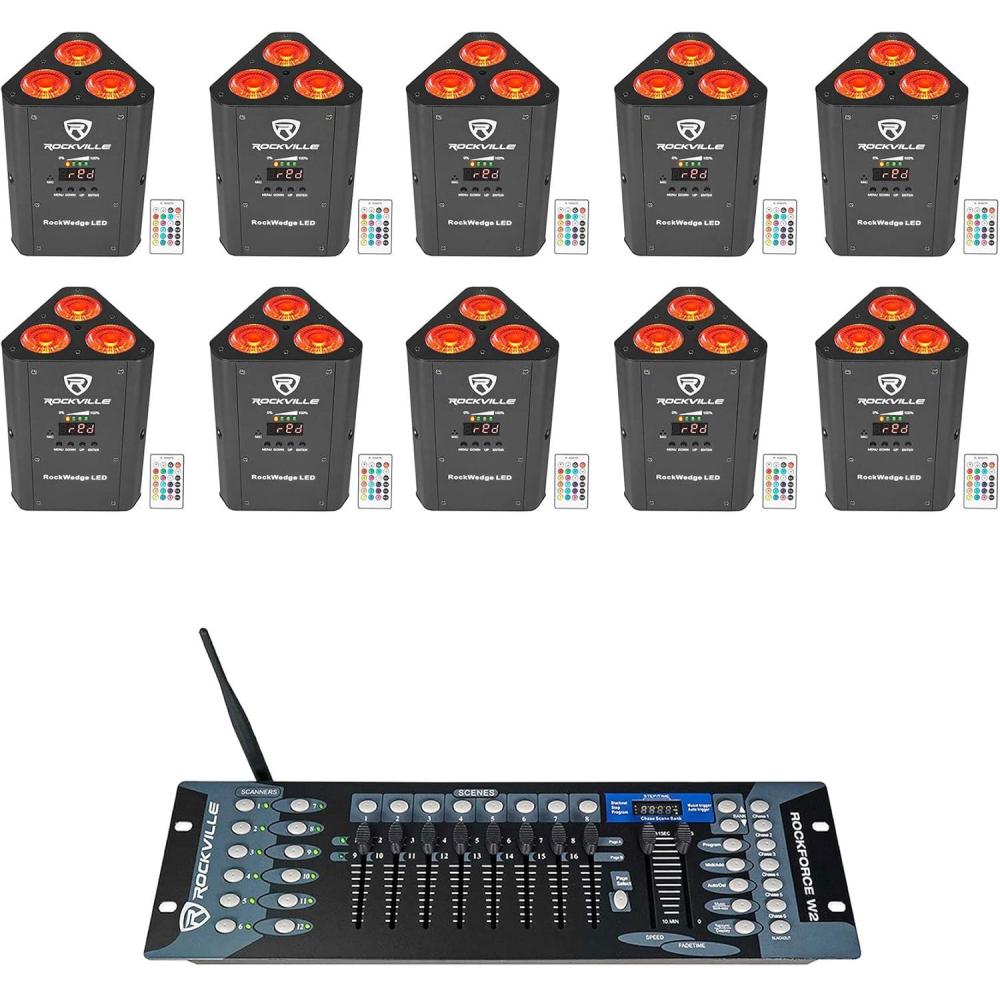 Package Includes: (10) Rockville RockWedge LED 54w RGBWA+UV Rechargeable Battery Wireless DMX Par Lights. (1) Rockville ROCKFORCE W2 192 Channel Wireless 2.4Ghz DMX Lighting Controller