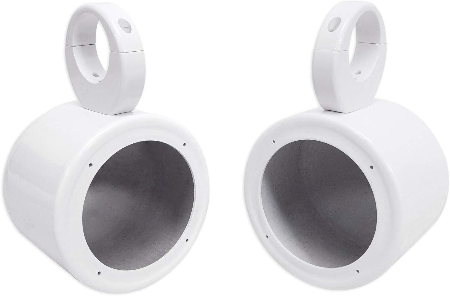 Features: Pair of RockvilIe MAC525W 5.25 white aluminum can wakeboard tower enclosures. Made of high quality 6061 aircraft grade aluminum. Beautiful white powder-coat finish. 100% waterproof and fully marinized against salt and fresh water conditions. Internally wired for clean installno exposed wires or terminals. High efficiency design features the perfect airspace for 6.5 speakers. Rugged universal mounting clamps made of 6061 aluminum