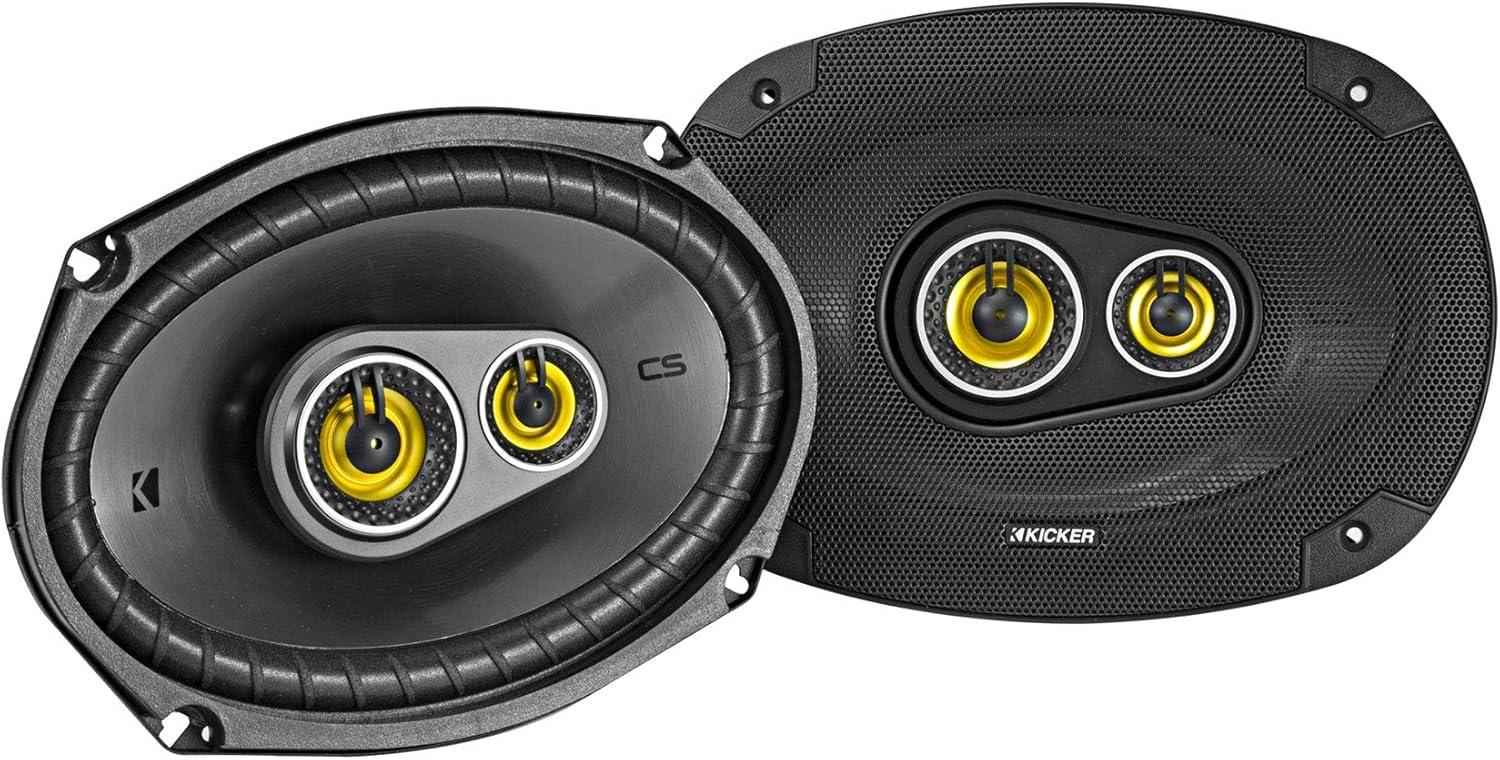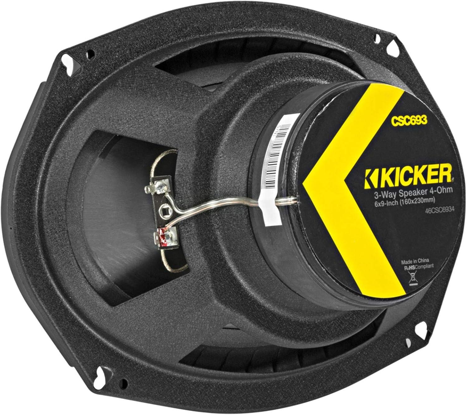 Pair KICKER 46CSC6934 6″x9″ 6×9″ 900 Watt 4-Ohm 3-Way Car Audio Speakers CSC693. Fits nearly every car made. Zero-protrusion tweeters to fit nearly any factory depth. Woofer EVC (Extended Voice Coil) tech assists with precise linear excursion. UV-treated poly-foam surround resists heat or direct sunlight. Large woofer magnet in a heavy-duty motor for ultra-clean bass. Integrated 2-inch (50mm) midrange drivers gives detailed attention to mid frequencies