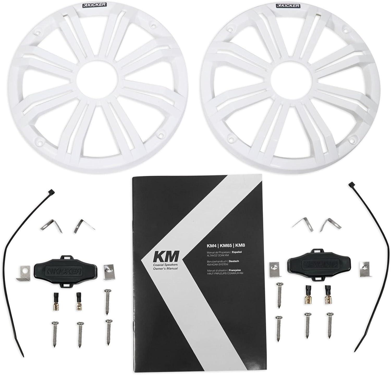 Features of 45KM84L: Pair KICKER 45KM84L 8″ 600 Watt Marine Waterproof Speakers w/ LED's, RMS Power Handling: 150 Watts (Per Speaker), Peak Power Handling: 300 Watts (Per Speaker), Sensitivity: 92 dB, Four-Ohm Voice Coil, One-Inch Titanium Tweeter, UV-Treated Polypropylene Woofer With Santoprene Surround, UV-Resistant Polymer Basket, Locking/Sealed Terminal Cover, Sealed Motor Structure, 316L Stainless Mounting Hardware Included, White and Charcoal Grilles With Seven-Color LED System Included