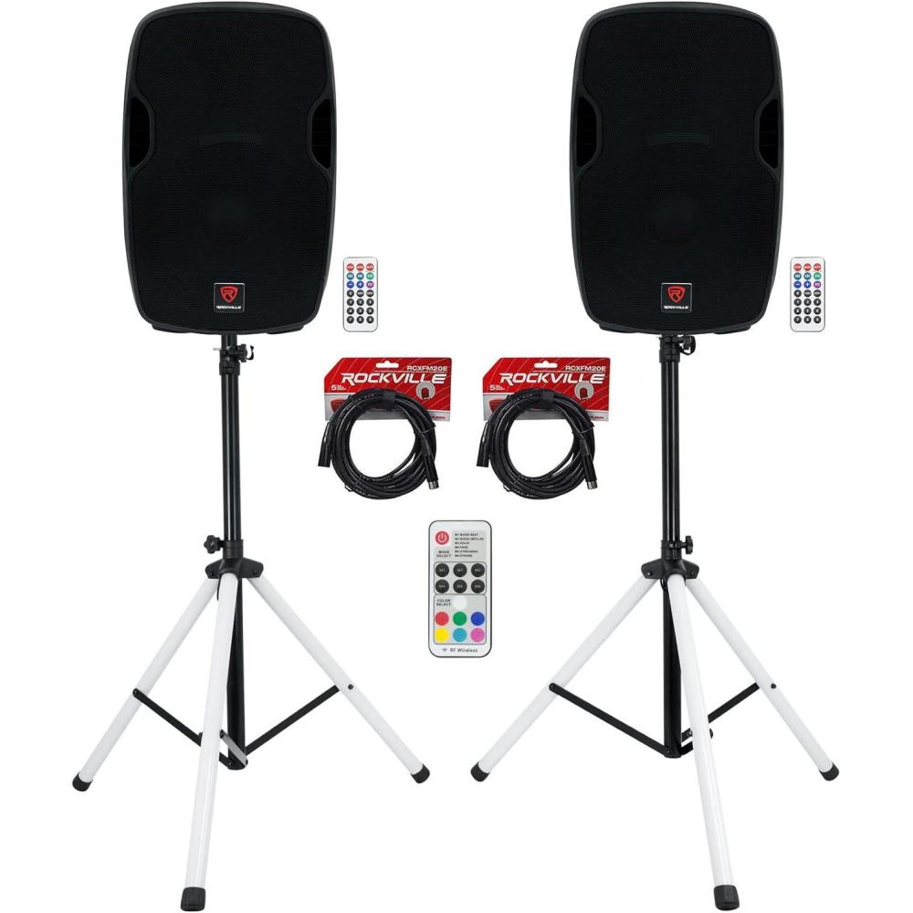 Package Includes: (2) Rockville BPA15 15″ Professional Powered Active 800w DJ PA Speaker w Bluetooth. (1) Pair of Rockville PARTY STAND LED DJ Tripod Speaker Stands+RGB Remote+Sound Activated. (2) Rockville RCXFM20E-B 20 Foot Female to Male XLR Mic Cable Black 100% Copper