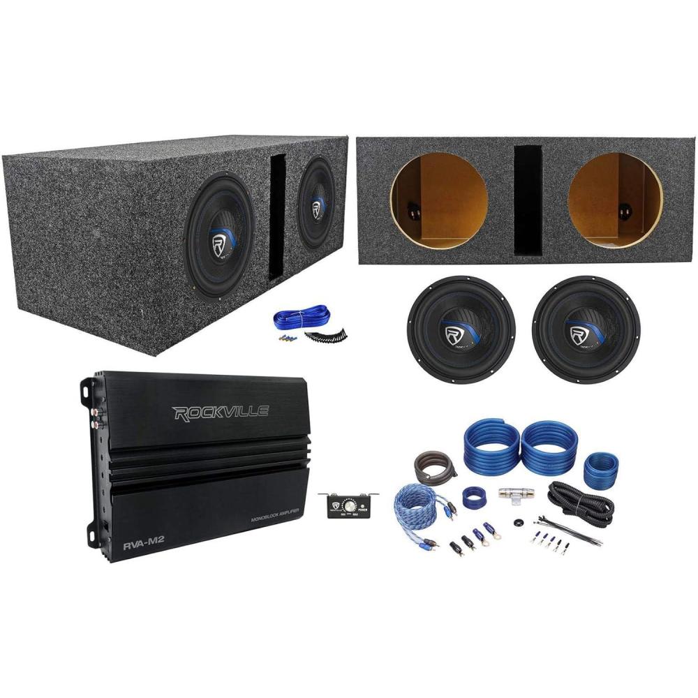 Package Includes: (2) RockvilIe K5 W10K5S2 10″ 1200w 2 Ohm Car Audio Subwoofer Sub 300w RMS CEA Rated!. (1) RockvilIe RVA-M2 2500w Peak/625w CEA RMS @ 1 Ohm Amplifier Mono Car Amp+Remote. (1) RockvilIe RWK41 4 Gauge Complete Car Amp Wiring Installation Wire Kit with RCA's. (1) RockvilIe RDV10 Dual 10 1.1 cu.ft. 3/4″ MDF Vented Subwoofer Enclosure Sub Box. 20 Drywall Wood Screws (Wood screws are the type of screws; the screws are actually made of metal). 20 Feet of 14 AWG Blue Speaker Wire