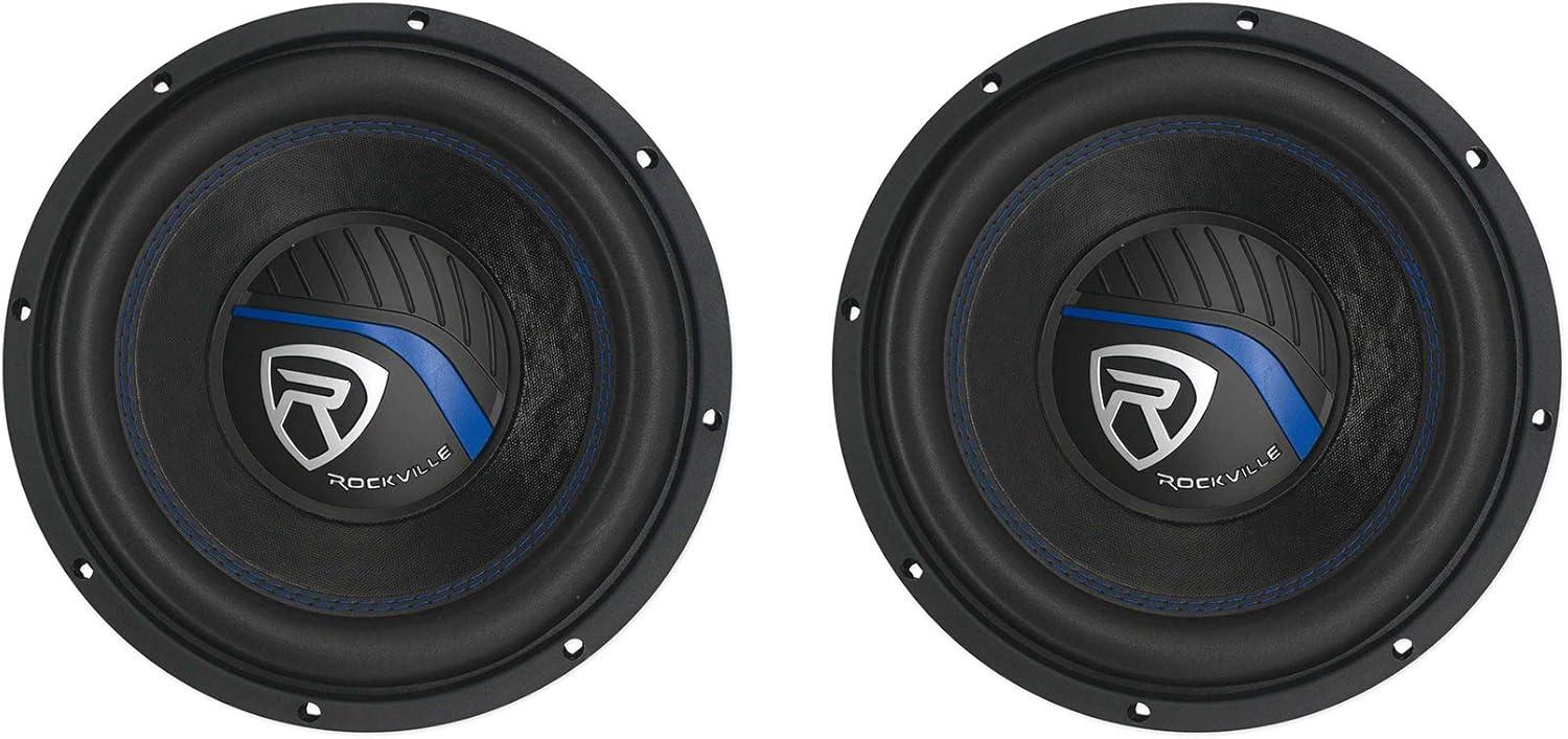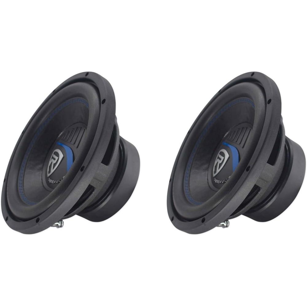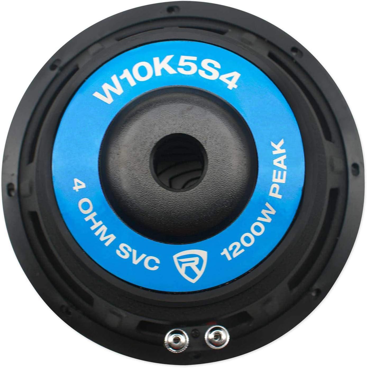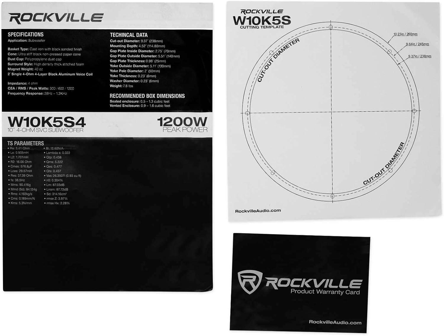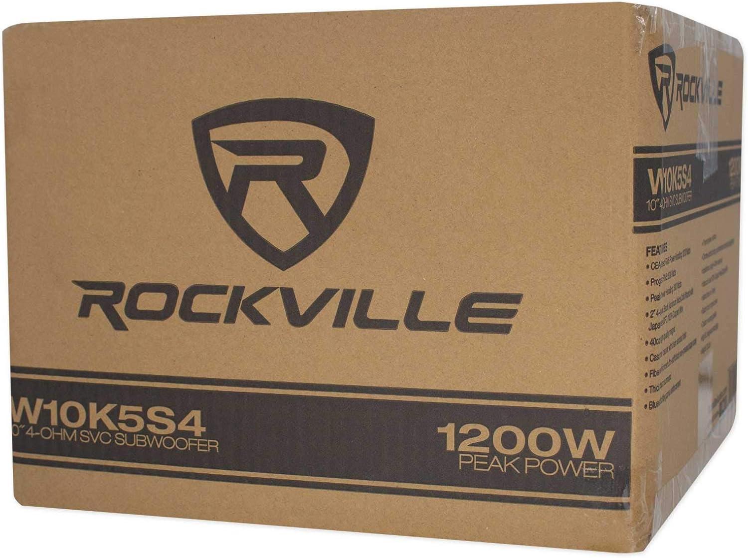 Package Includes: (2) RockvilIe K5 W10K5S4 10″ 1200w 4 Ohm Car Audio Subwoofer Sub 300w RMS CEA Rated!. Features: RockvilIe W10K5S4 K5 Series 10″ 4-Ohm Car Subwoofer. Peak Power Handling: 1200 Watts. Program Power Handling: 600 Watts. CEA Rated RMS Power Handling: 300 Watts. 2″ 4-Layer Black Aluminum Voice Coils Wound with OFC (100% Copper) Wire. The wire we use to wind the voice coil is imported from Japan which is way better quality than the standard China wire. 40 Oz High Quality Magnet