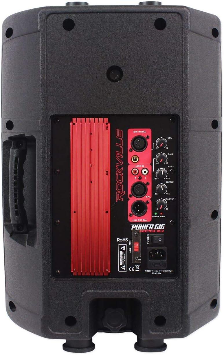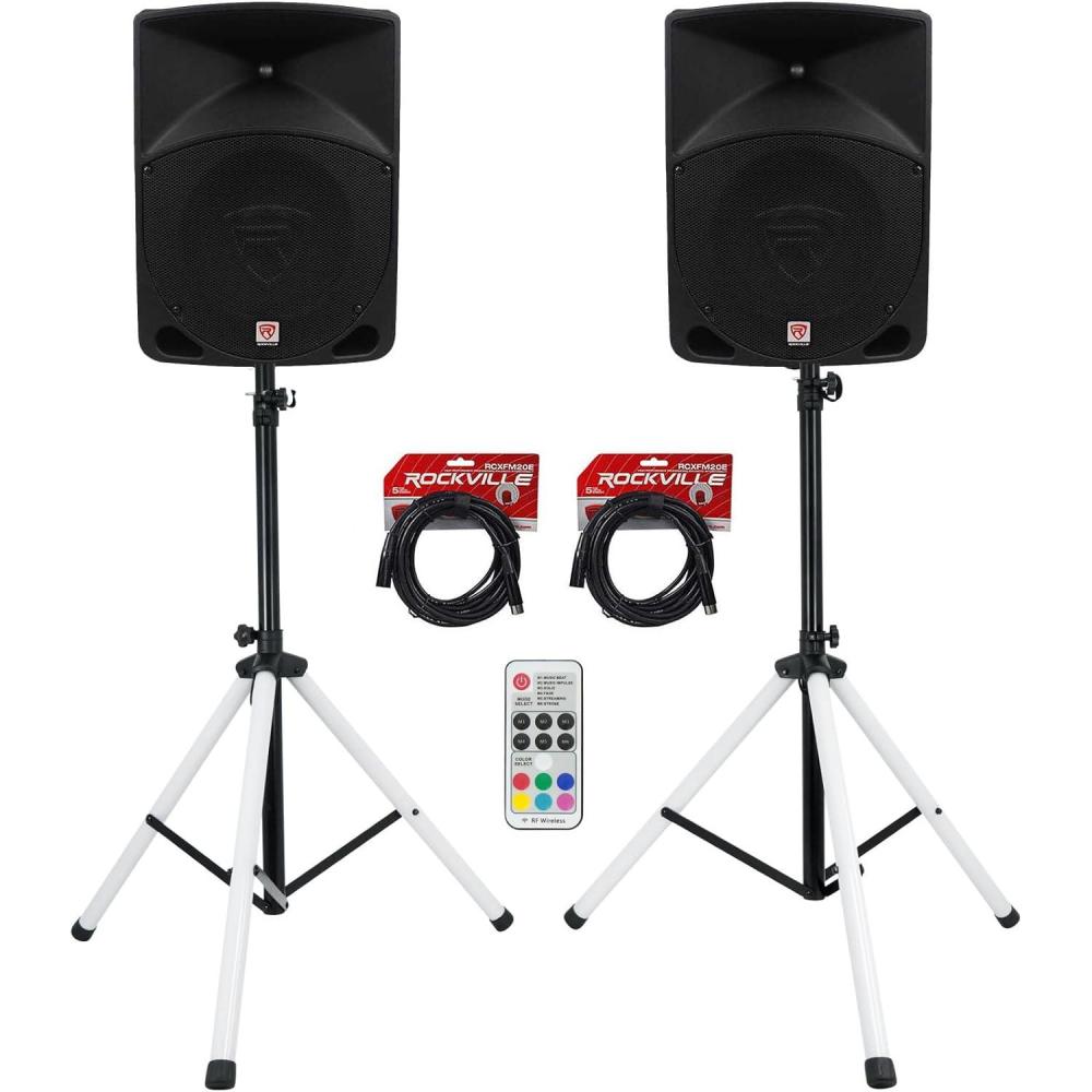 Package Includes: (2) RockvilIe RPG10 10″ Powered Active 600 Watt 2-Way DJ PA Speaker System. (2)Gemini STL-100 Tripod DJ Karaoke Speaker Stand w/Customizable LED's + Remote. (2) RockvilIe RCXFM20E-B 20 Foot Nickel Plated Female to Male XLR Microphone Cable. Features: RockvilIe RPG10 10″ Active/Powered 600 Watts DJ/PA Speaker System. 150-Watt RMS / 300 Watts Program Power / 600 Watts Peak