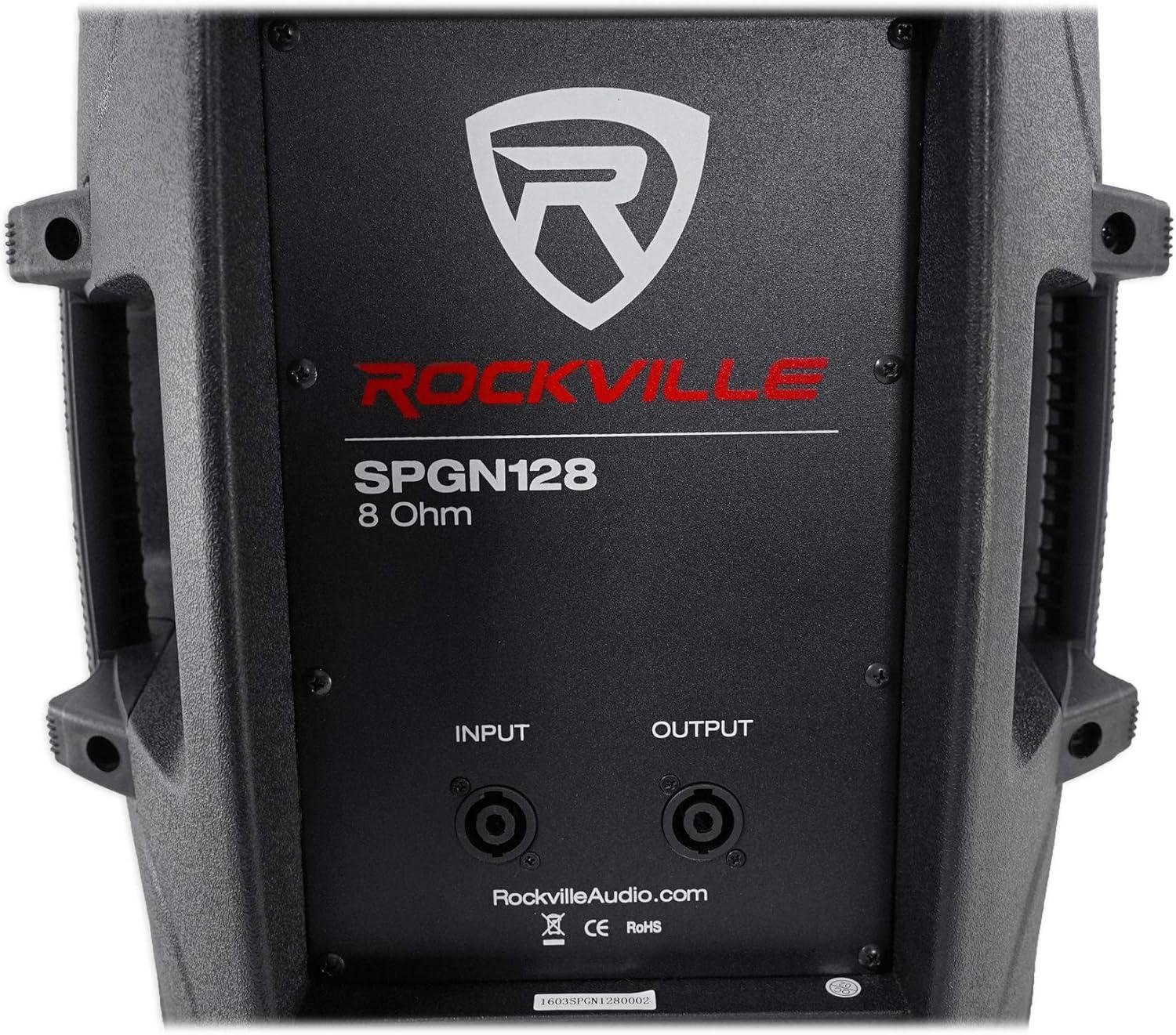 Features of SPGN128: Rockville SPGN128 12“ Passive 1200 Watt 8 Ohm Lightweight DJ PA ABS Cabinet Speaker. Power Handling: 300 Watts RMS / 600 Watts Program Power / 1200 Watts Peak. High power long-throw 12'' woofer with 2.5“ aluminum voice coil provides incredibly deep bass and acoustic power. High-power 2-way pro sound reinforcement speaker system for live sound and play back applications. Compact and light weight system delivers distortion free sound even at extreme SPL. State-of-the-art 1.35'' Japanese made pure titanium-diaphragm compression driver for crystal clear high-frequency reproduction. Twist-Lock speakon input and output connections.