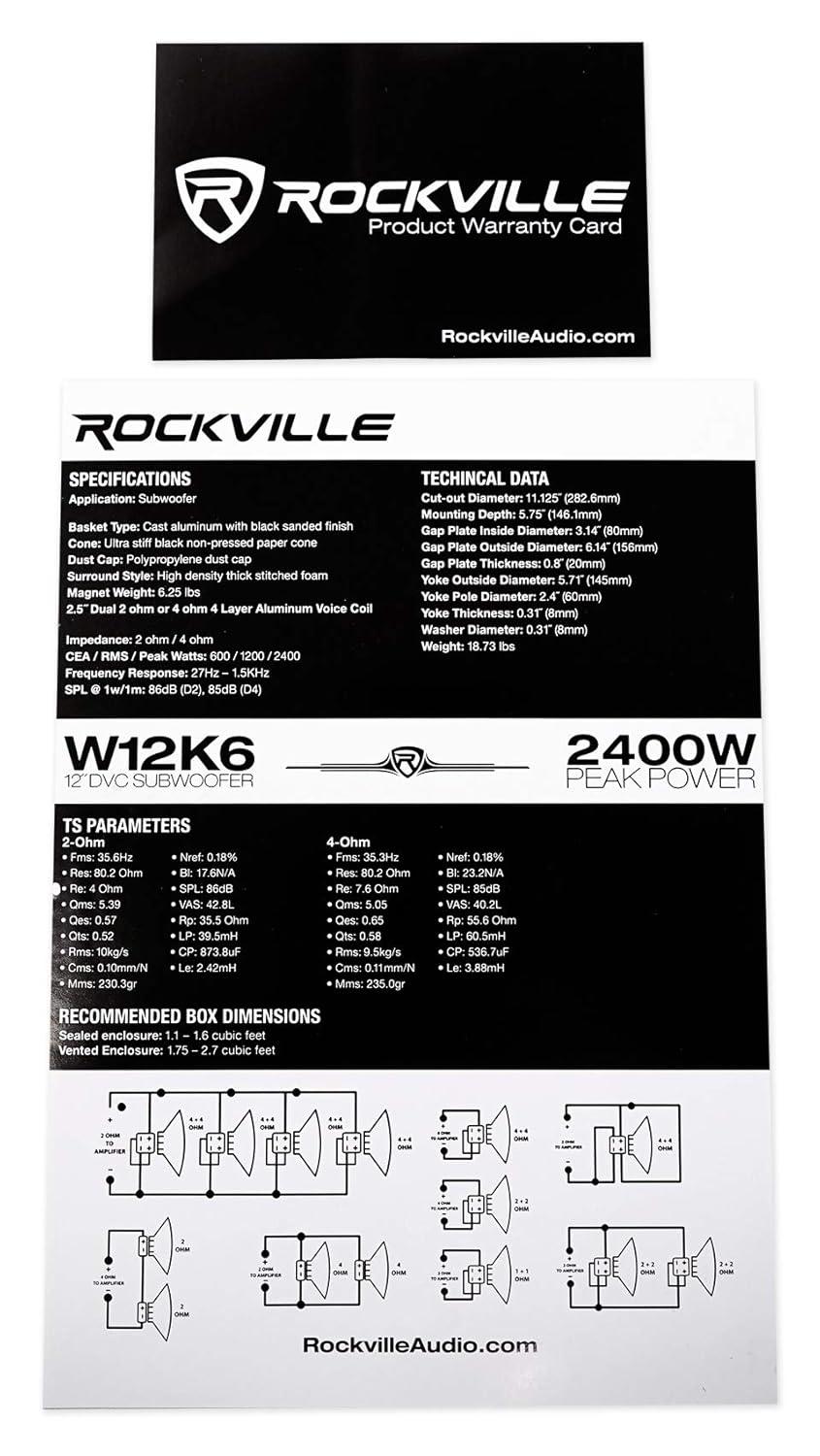 RockvilIe W12K6D4 V2 K6 Series 12″ Dual 4-Ohm Car Subwoofer. Peak Power Handling: 2400 Watts. Program Power Handling: 1200 Watts. CEA Rated RMS Power Handling: 600 Watts. 2.5″ 4-Layer Black Aluminum Voice Coils Wound with OFC (100% Copper) Wire. The wire we use is made in the USA! It is one of the most important components to make the sub high quality and last longer. Double Stacked 100 Oz High Quality Magnet. Cast Aluminum Basket With Black Sanded Finish Makes This Sub Very Efficient