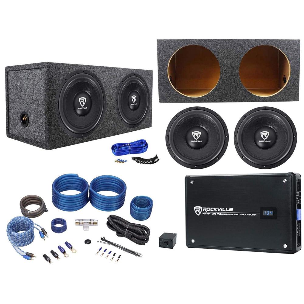 Package Includes: (2)RockvilIe 12″ Car Audio Subwoofer. (1)RockvilIe RXD-M3 4000 Watt/2000w RMS Mono Class D 1 Ohm Amplifier Car Stereo Amp. (1)RockvilIe RWK41 4 Gauge Complete Car Amp Wiring Installation Wire Kit with RCA's. (1)RockvilIe Dual 12 1.25 cu.ft. 3/4 MDF Sealed Subwoofer Enclosure Sub Box. 20 Drywall Wood Screws (Wood screws are the type of screws; the screws are actually made of metal). 20 Feet of 14 AWG Blue Speaker Wire. 4 Spade Terminals. Features: