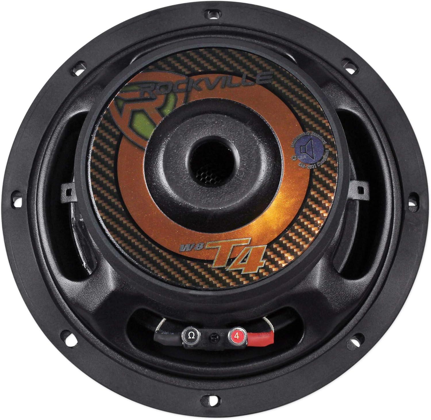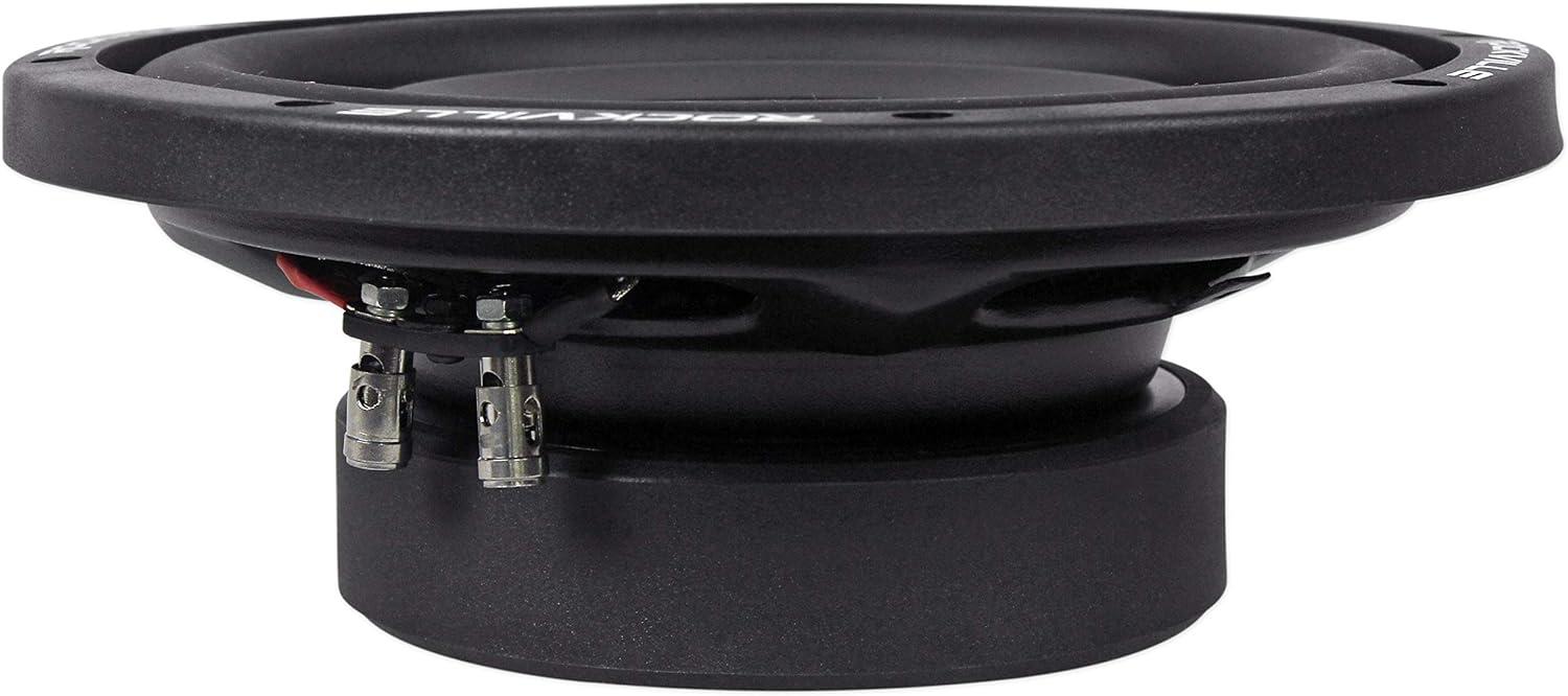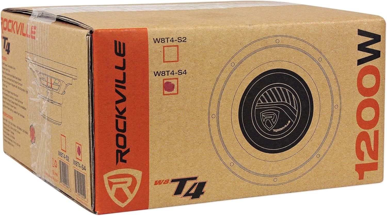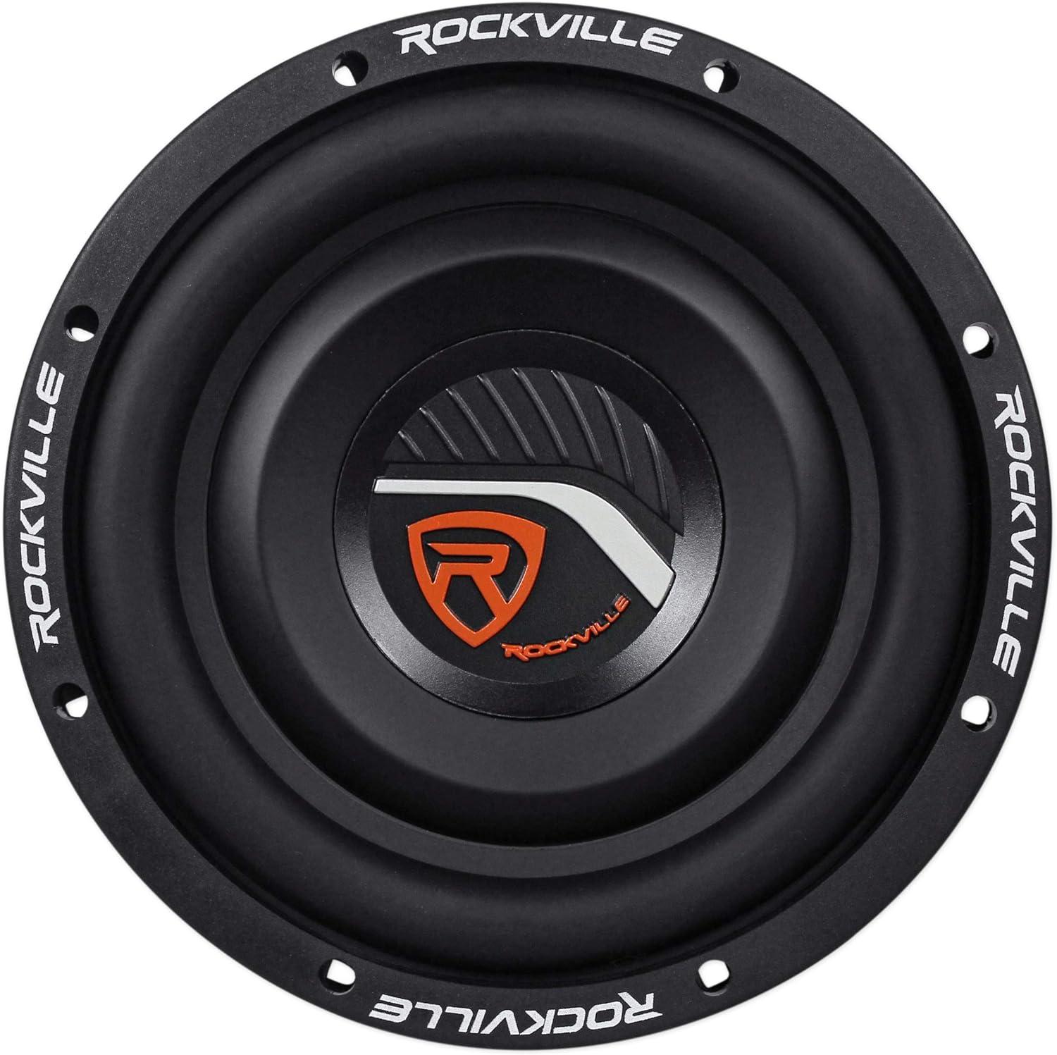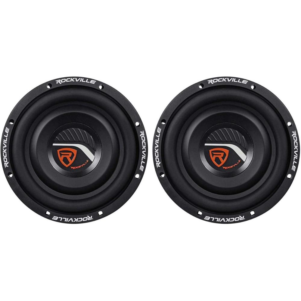 Features: Rockville W8T4-S2 8 1000 Watt 2-Ohm Shallow Mount Car Subwoofer. Power Handling: 1000 Watts Peak Power / 500 Watts Program / 250 Watts RMS (CEA Rating). Ultra Stiff Paper Composite Cone. 3D Molded High Gloss Acrylic Dust Cap. Ultra Slim, Expanded and Rolled Steel Basket
