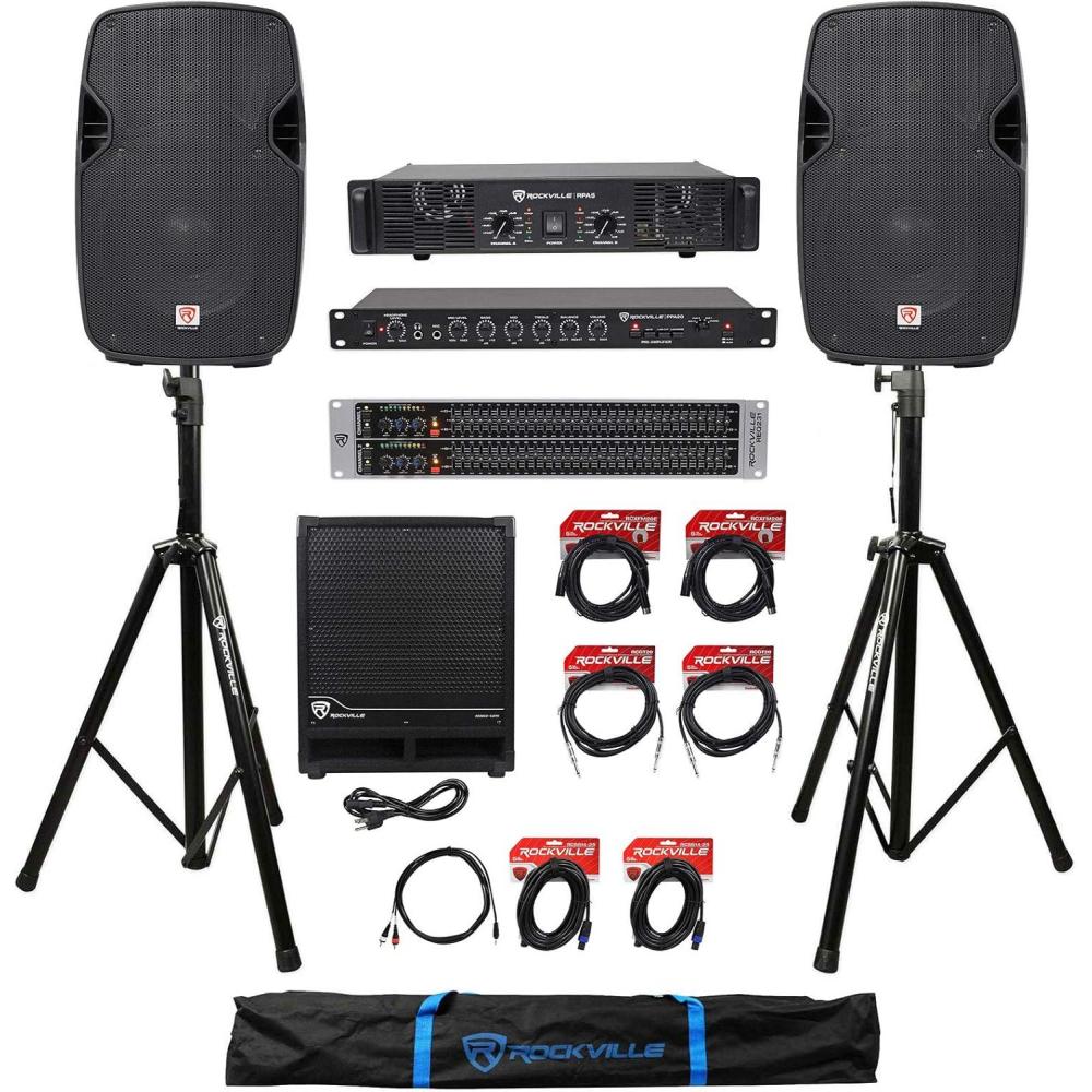Package Includes: (2) Rockville SPGN108 10″ Passive 800 Watt DJ PA Speakers Lightweight Cabinet 8 Ohm. (1) Pair of Rockville Tripod DJ PA Speaker Stands + Carrying Case Black RVSS2. (1) Rockville RPA5 Pro/DJ Amp. (1) Rockville PPA20Pre-Amplifier . (1) Rockville REQ231 Equalizer. (1) Rockville RBG12S Bass Gig. (2) Rockville RCXFM20E-B Cables Black. (2) Rockville RCGT20B Cables-Black 100% Copper. (2) Rockvile RCSS1425. (1) Rockville RNRMR10