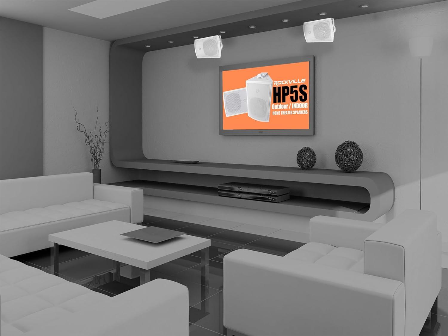 Features: Pair of Rockville HP5S 5.25 White 420 Watt Outdoor / Indoor Home Theater Speakers with Swivel Bracket. Peak Power Handling: 420 Watts (per pair). RMS Power Handling: 140 Watts (per pair)