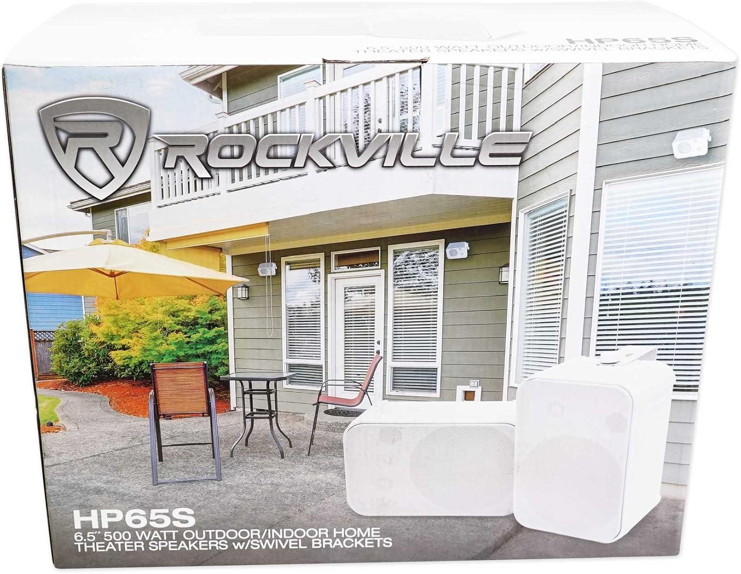 Features: Pair of RockvilIe HP65S 6.5 White 500 Watt Outdoor / Indoor Home Theater Speakers with Swivel Bracket. Peak Power Handling: 500 Watts (per pair). RMS Power Handling: 160 Watts (per pair)