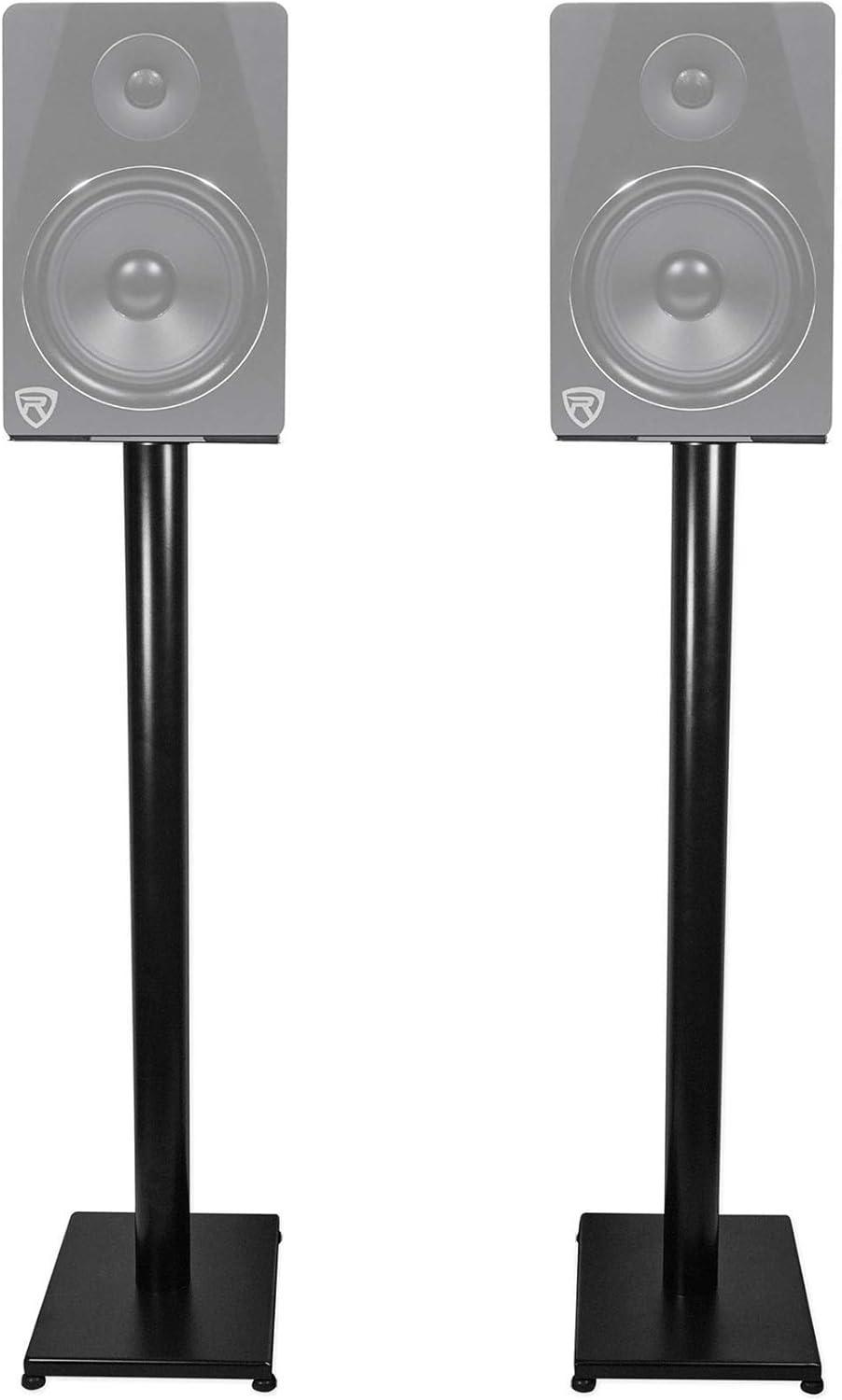 Rubber surrounds on woofer. Rubber surrounds on woofer. Includes: (2) Stands. (2) top plates. (2) Bottom plates. (4) Screws. (4) EVA isolation pads. (8) Brass spikes. (8) Rubber feet. (2) RockvilIeRS37B 37″ Inch Speaker Stands. High performance steel speaker stands. Robust metal poles support 60 LBS speakers. Finished with premium furniture-grade powder coated paint that will not crack, chip, or peel. Fully adjustable Brass spikes for carpet installation (even if floor is not even)