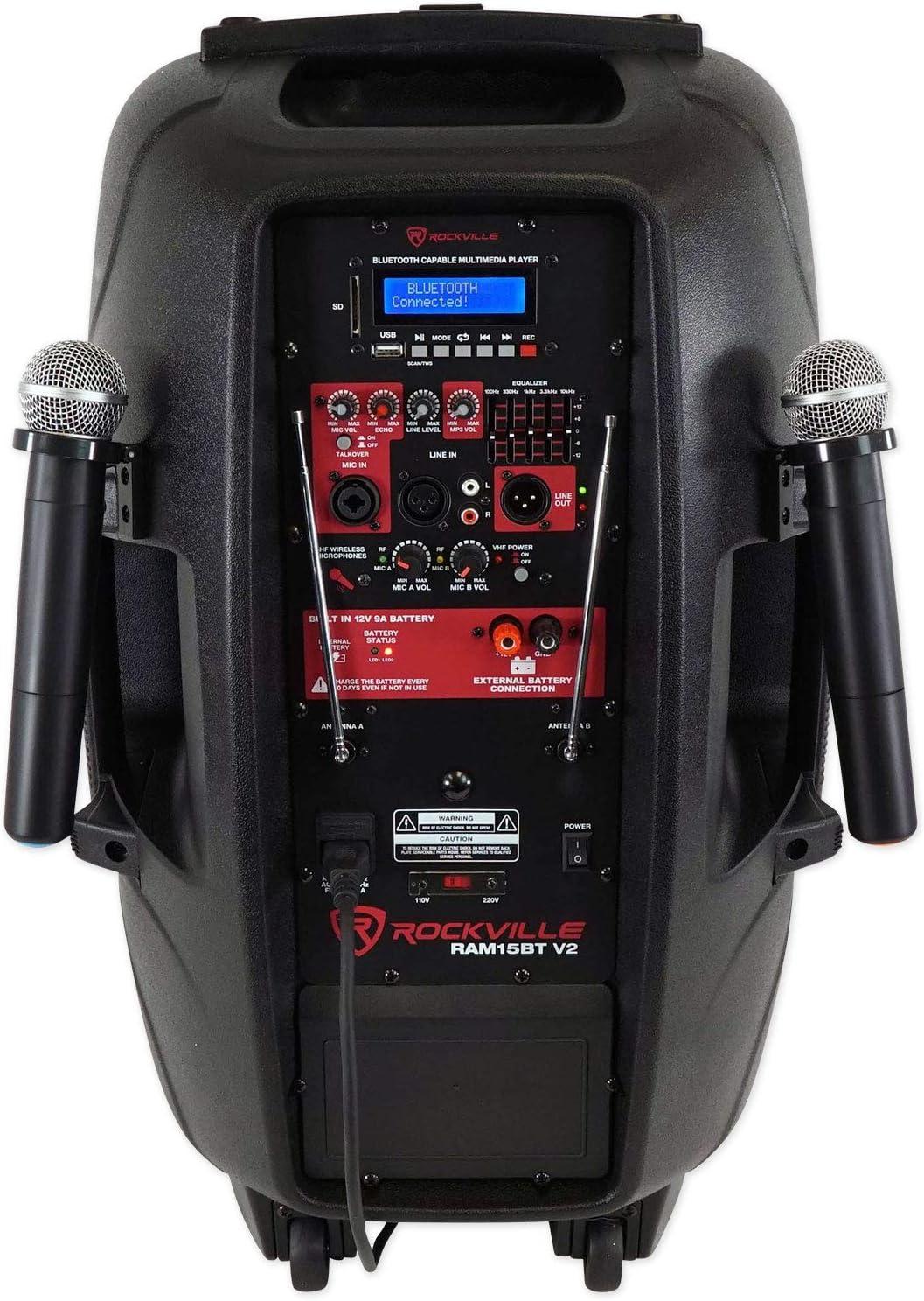 Features of RAM15BT: RockvilIe RAM15BT 15″Portable Rechargeable 800W DJ PA Speaker, 2 Mics, Bluetooth, 15″ Amplified Portable Pro Audio Speaker, Power Ratings: 800 Watts Peak Power, 400 Watts Program Power, 200 Watts RMS, Built-In USB (2.0)/SD/MMC/MP3 Inputs w/LCD Display (supports MP3, WMA, WAV)