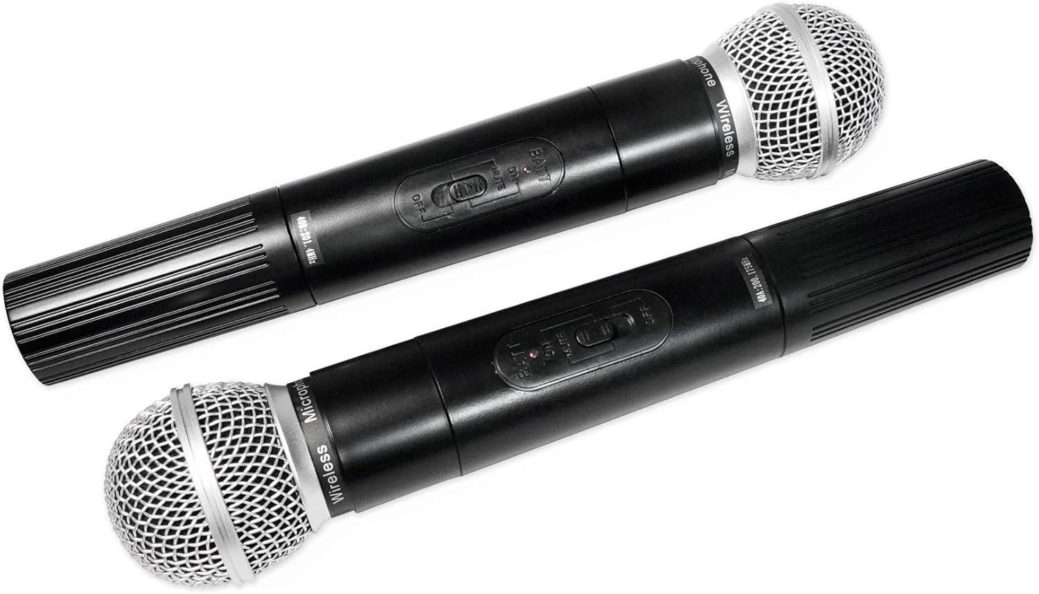 Wireless Mic Capability with 2 Wireless Mics Included, Microphone Range – 114 Ft, Built-In 12V-9AH Battery for Portability, Speaker can play for 4-8 hours per charge depending on volume level, Optional External Battery Connection for Extended Play Time