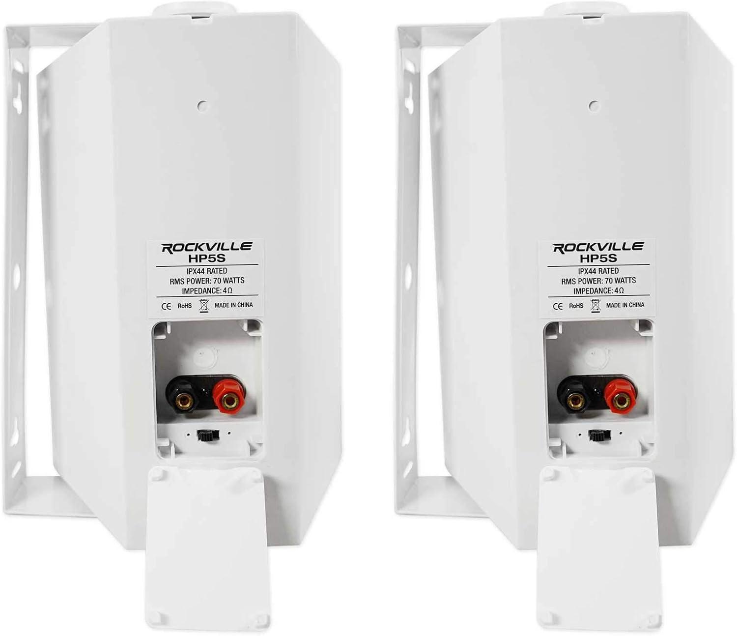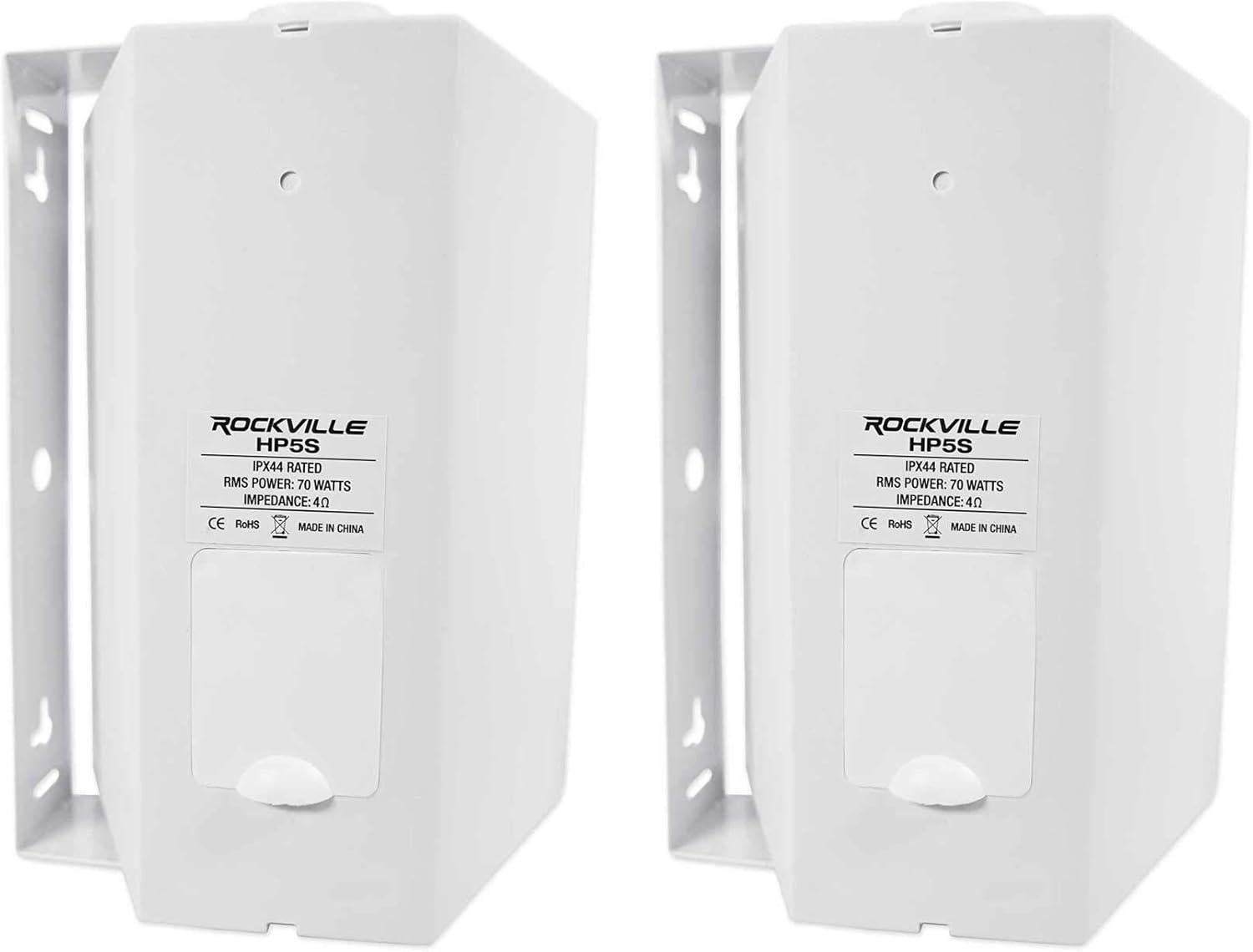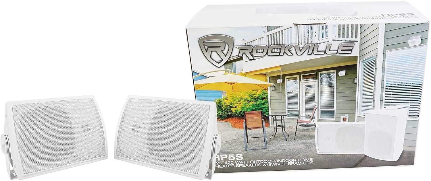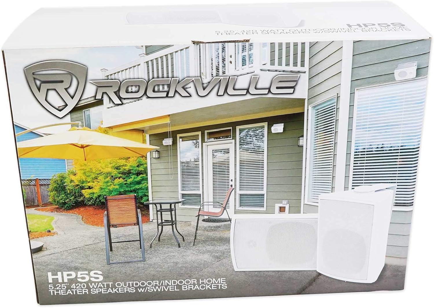 Features: Pair of Rockville HP5S 5.25 White 420 Watt Outdoor / Indoor Home Theater Speakers with Swivel Bracket. Peak Power Handling: 420 Watts (per pair). RMS Power Handling: 140 Watts (per pair)