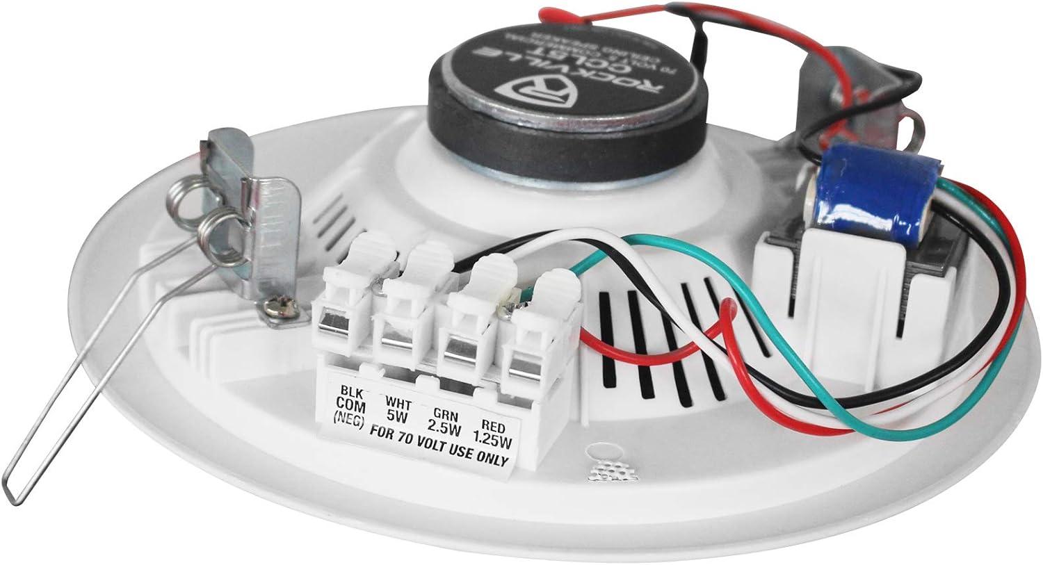 70V Power Options: 5w (White). 2.5w (Green). 1.25w (Red). Features: (12) RockvilIe CCL5T White 70V 5″ Commercial Ceiling Speakers