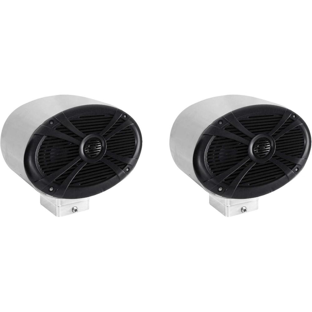 Made of high quality 6061 aircraft grade aluminum. Hand polished for beautiful chrome finish. 100% waterproof and fully marinized against salt and fresh water conditions. Internally wired for clean installno exposed wires or terminals. High efficiency design features the perfect airspace for 6 x 9 speakers. Rugged universal mounting clamps made of 6061 aluminum. Includes precision molded, high impact plastic inserts for tower fitment from 2 diameter to 2.5 diameter
