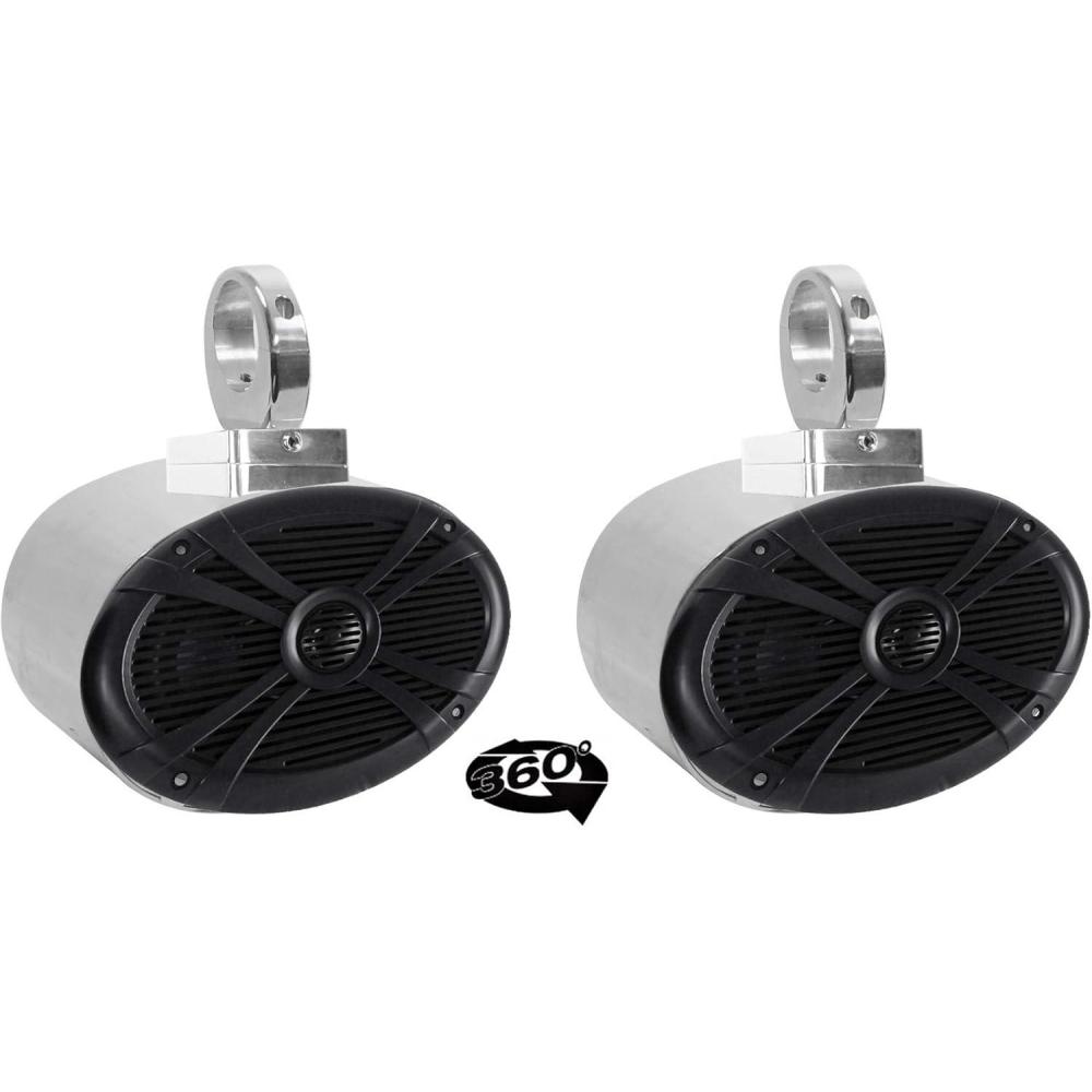 Made of high quality 6061 aircraft grade aluminum. Hand polished for beautiful chrome finish. 100% waterproof and fully marinized against salt and fresh water conditions. Internally wired for clean installno exposed wires or terminals. High efficiency design features the perfect airspace for 6 x 9 speakers. Rugged universal mounting clamps made of 6061 aluminum. Includes precision molded, high impact plastic inserts for tower fitment from 2 diameter to 2.5 diameter