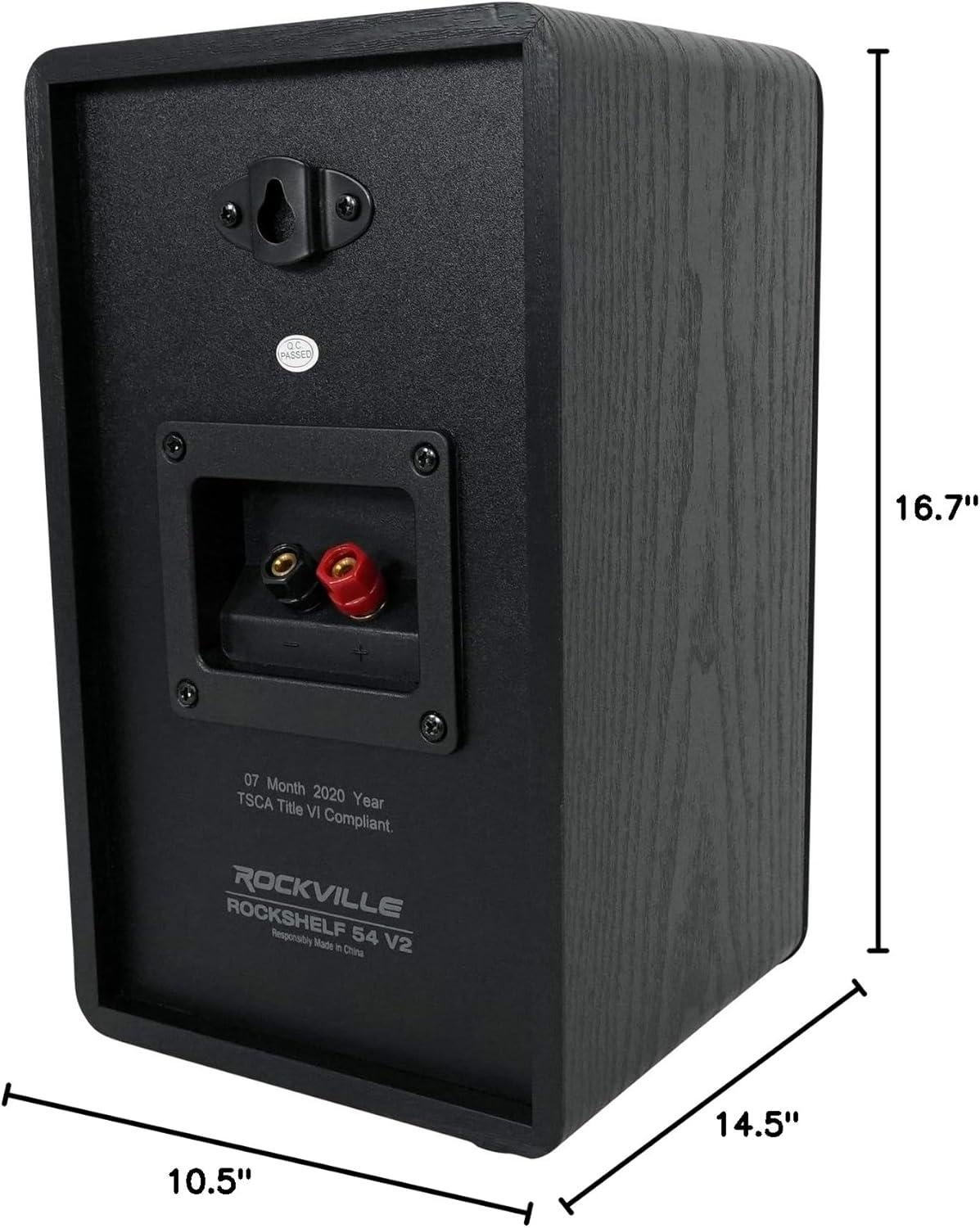 Package Includes: (1)PairRockvilIe RockShelf 54B 360w Black 5.25″ Home Theater Bookshelf Speakers/4 Ohm. (1) Pair of RockvilIe RHTSC 36″ Inch Bookshelf Speaker Stands Surround Sound Home Theater. Features: Pair RockvilIe RockShelf 54B V2 Black 5.25″ Home Bookshelf Speakers/4 Ohm/Kevlar. RMS Power: 45 Watts Each / 90 Watts per pair. Peak Power: 180 Watts Each / 360 Watts per pair. Woofer: 5.25 Kevlar cone. Tweeter: 1 Silk dome tweeter