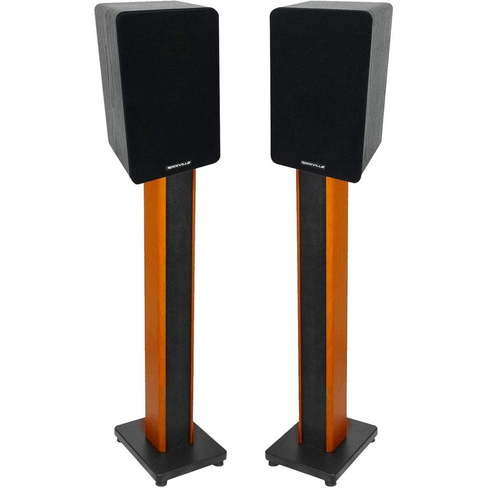 Features: (2) RockvilIe RHTSC 36″ Inch Bookshelf Speaker Stands Surround Sound Home Theater. Pair RockvilIe RHTSC high performance wood speaker stands. (2) Pairs of Top Platforms for different size speakers. Finished with premium furniture-grade paint that will not crack, chip, or peel. Made from high quality medium density fiber core to minimize resonance. Brass & Rubber spikes add stability to any floor surface