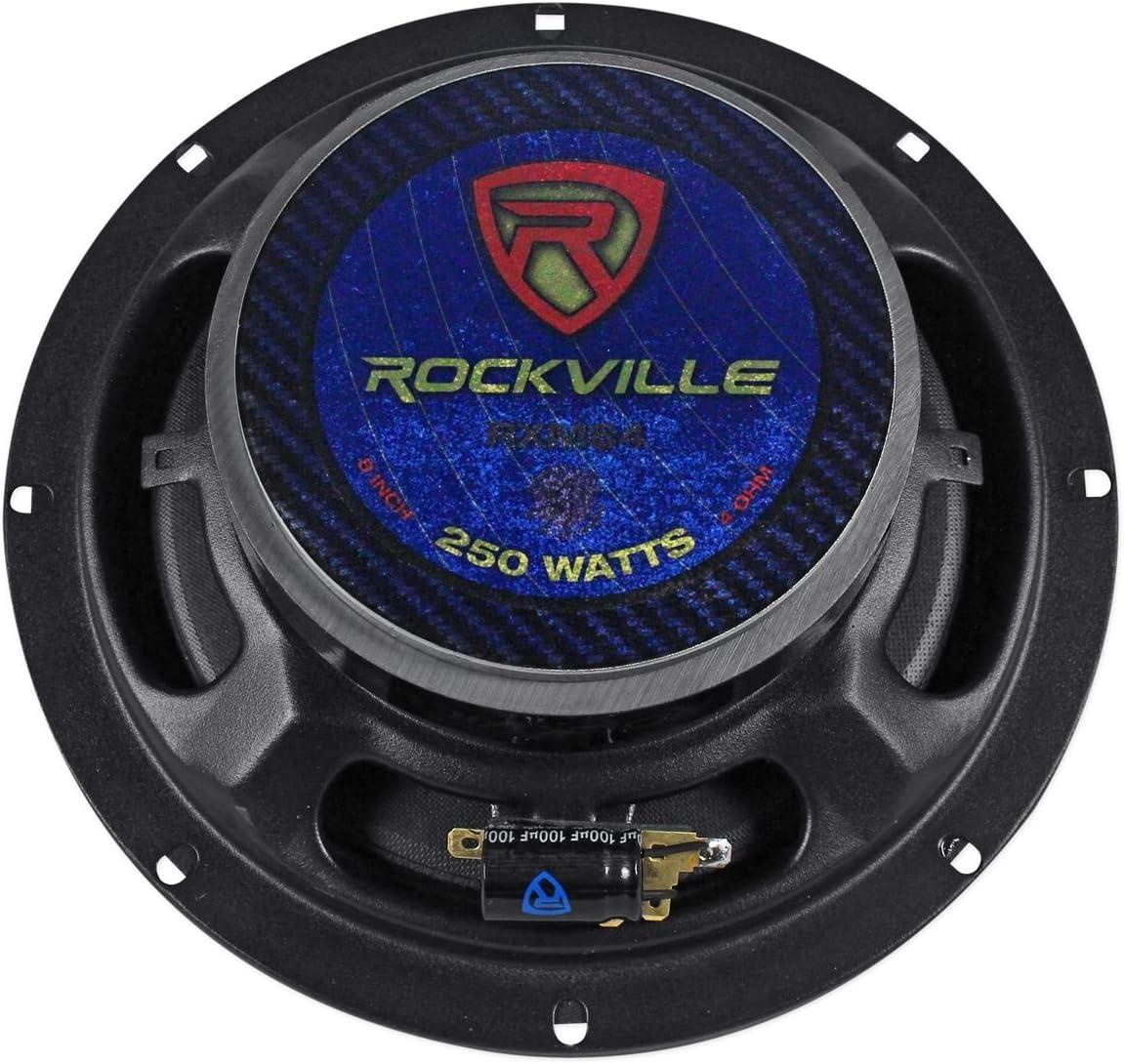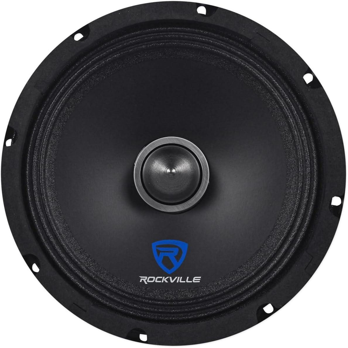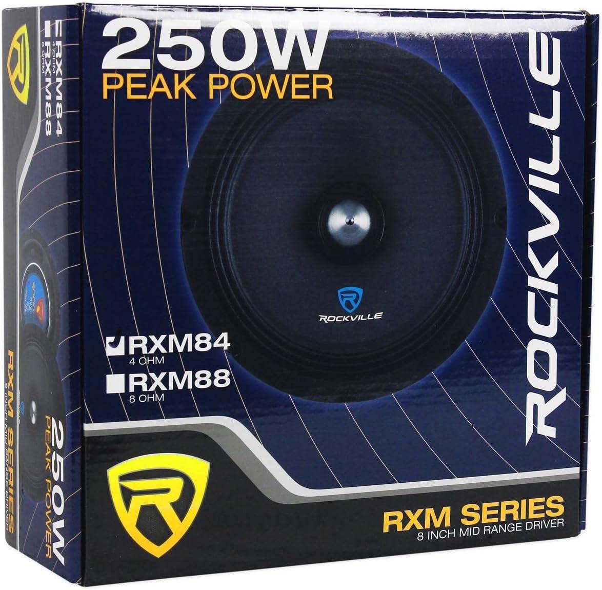 (2) Rockville RXM84 8″ 4-Ohm Car Speakers Totaling 500 Watts. Rockville RXM84 8 Inch 250 Watts / 125 Watts RMS 4-Ohms Mid-Bass Car Audio Speaker. Power Handling 250 watts Peak / 125 Watts RMS