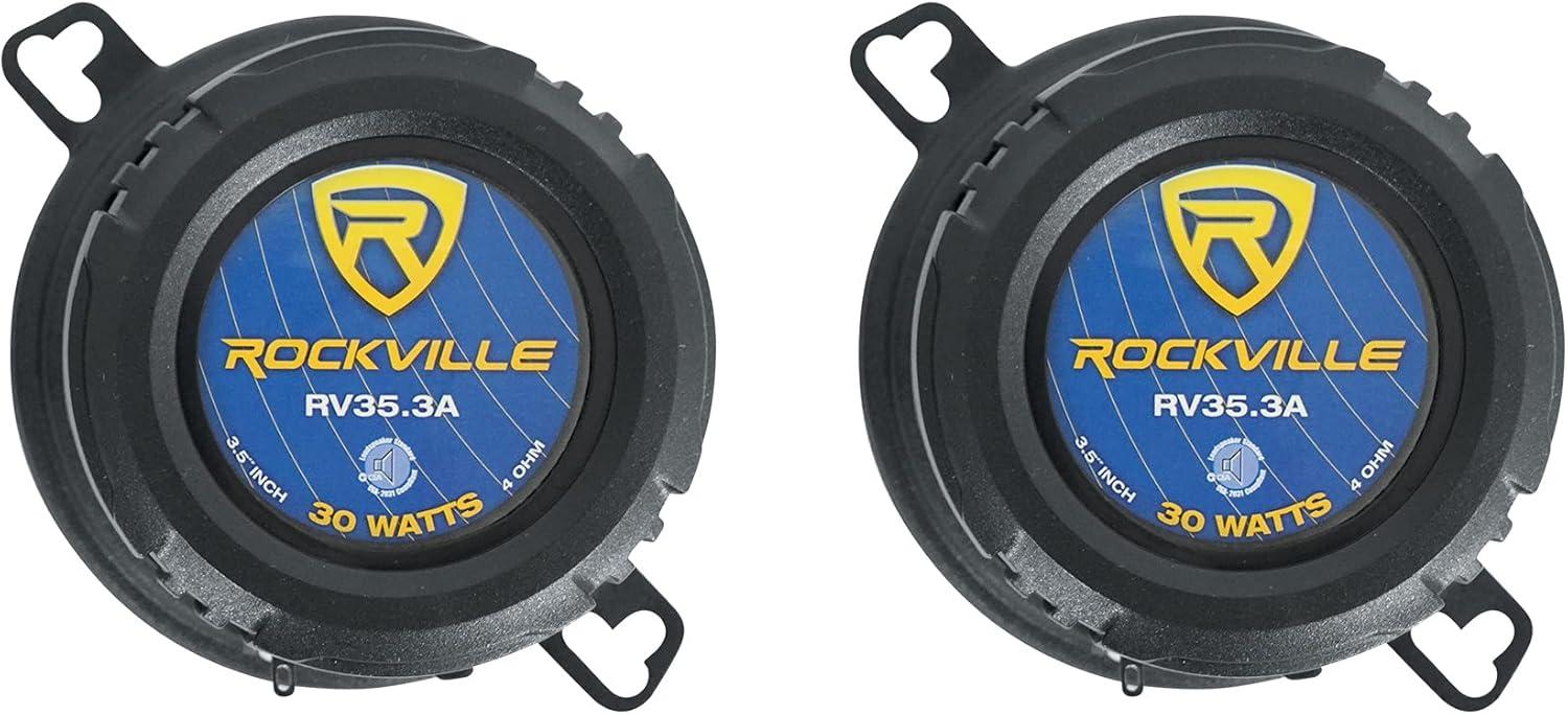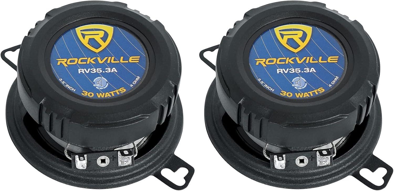 Pair RockvilIe RV35.3A 3.5″ 3-way car speakers. Peak Power Rating: 200 Watts per Pair / 100 Watts Each. CEA Compliant RMS Rating: 60 Watts per Pair / 30 Watts Each