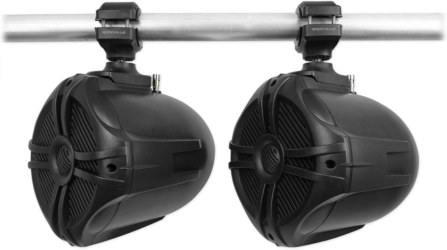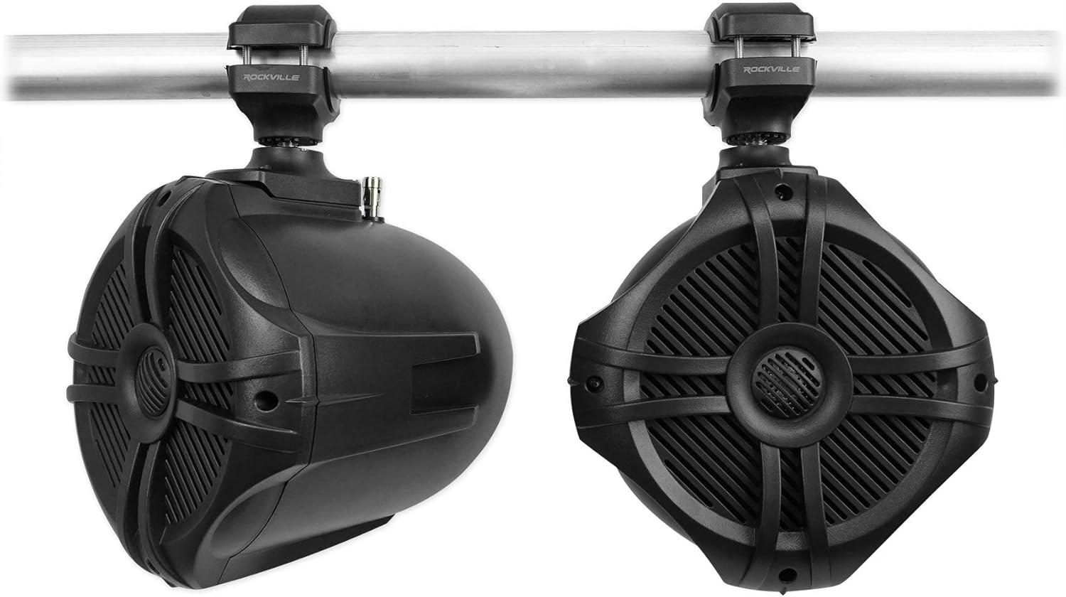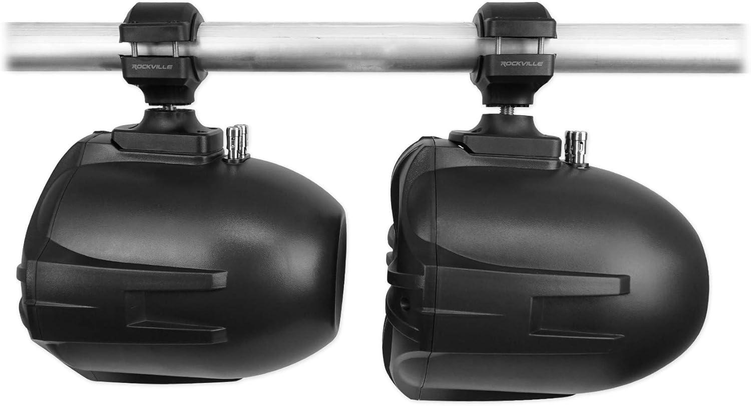 (2) RockvilIe RWB70B Black 6.5″ 250w Marine Wakeboard 360 Swivel Tower Speakers. Color : Black. 6.5″ Two-Way High Fidelity Speaker System. Adjustable Nylon Mounting Bracket Reinforced With Embedded Steel. Includes Stainless Steel Mounting Hardware. 1″ Polymide Dome Neodymium Midrange Tweeter. Built-In Two-Way Crossover Network. Fully Marinized Against Salt & Fresh Water Conditions. Completely Water / Rust Resistant. Terminals Are Sealed with Rubber Gaskets. Specially Tuned for PA Voice Over