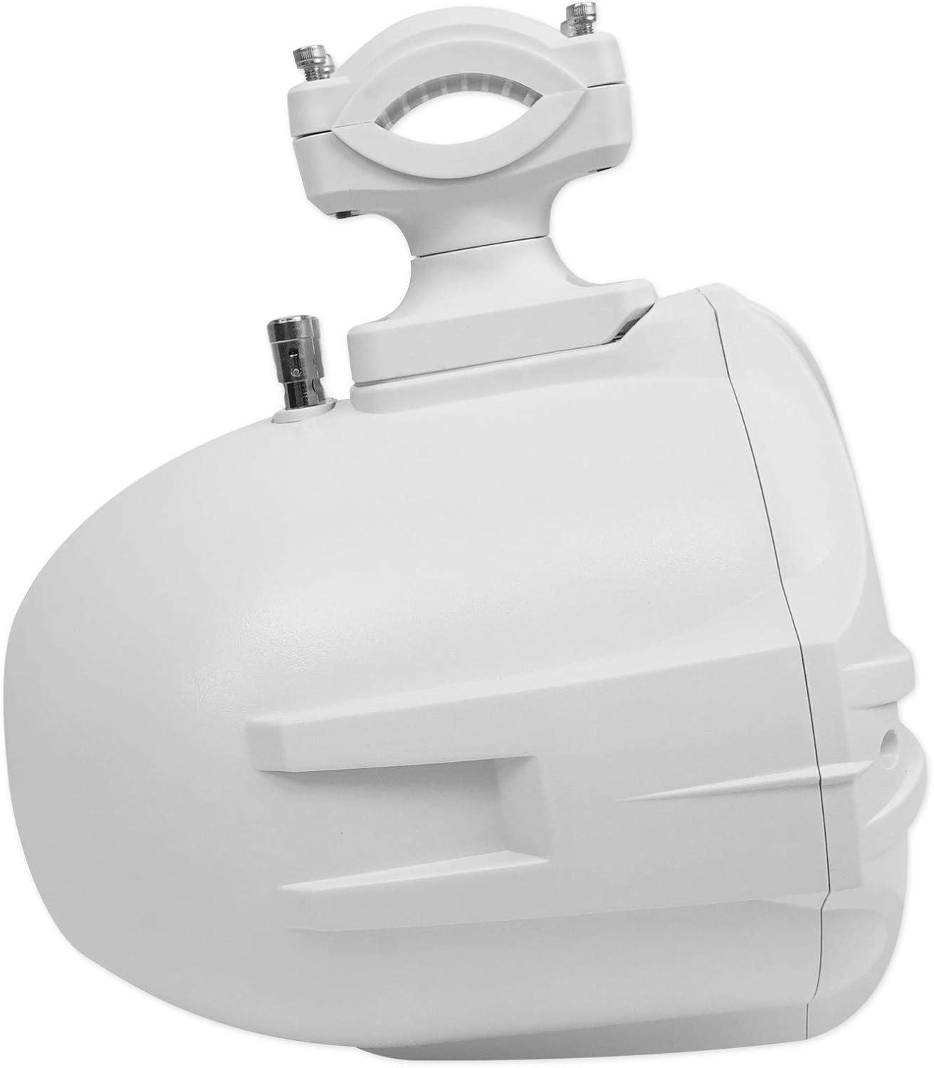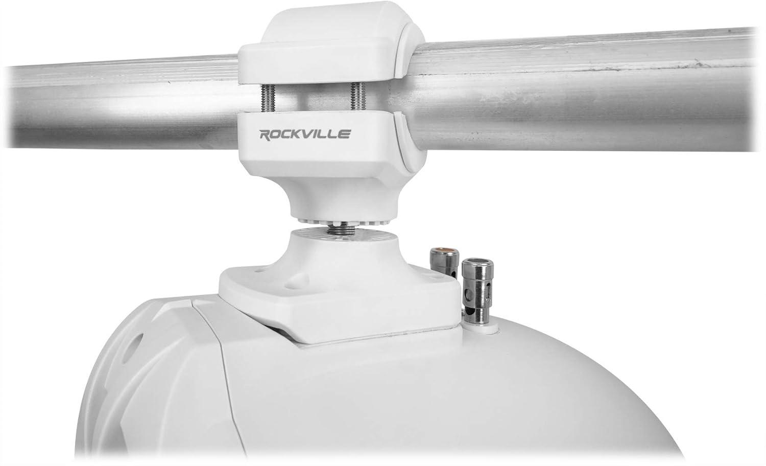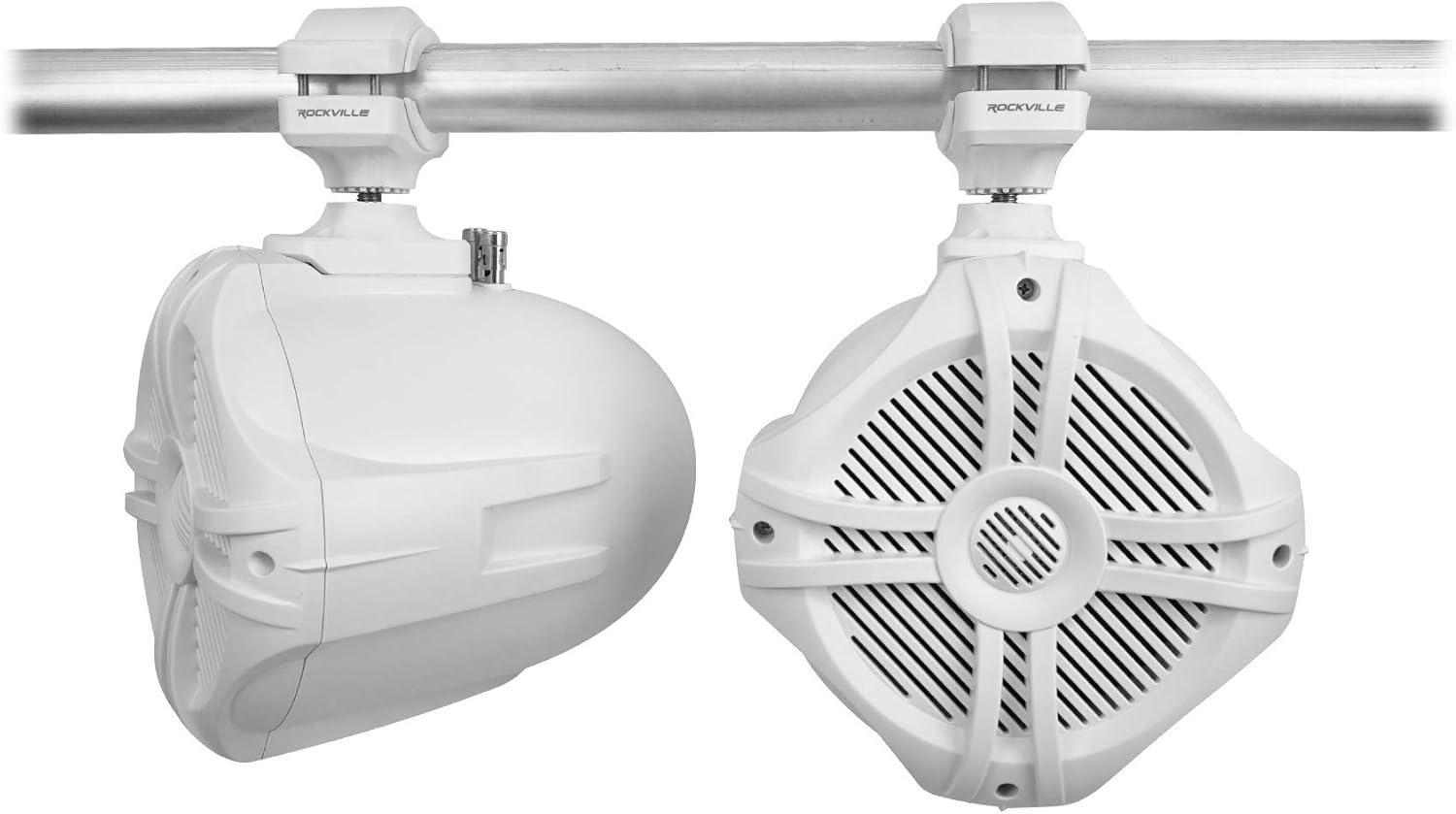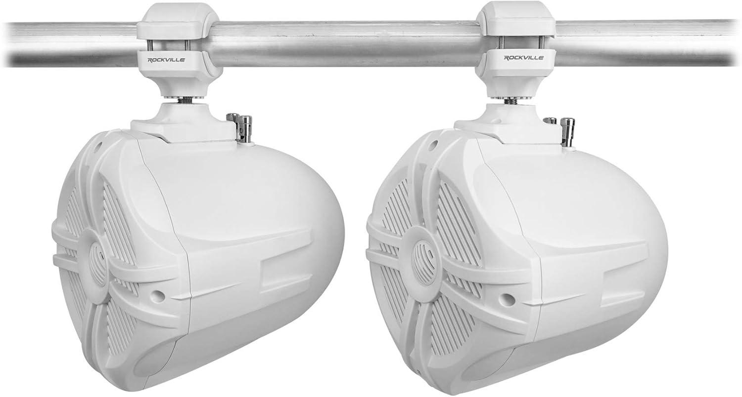 (2) RockvilIe RWB70W White 6.5″ 250w Marine Wakeboard 360 Swivel Tower Speakers. Color: White. 6.5″ Two-Way High Fidelity Speaker System. Adjustable Nylon Mounting Bracket Reinforced With Embedded Steel. Includes Stainless Steel Mounting Hardware. 1″ Polymide Dome Neodymium Midrange Tweeter. Built-In Two-Way Crossover Network. Fully Marinized Against Salt & Fresh Water Conditions. Completely Water / Rust Resistant. Terminals Are Sealed with Rubber Gaskets. Specially Tuned for PA Voice Over