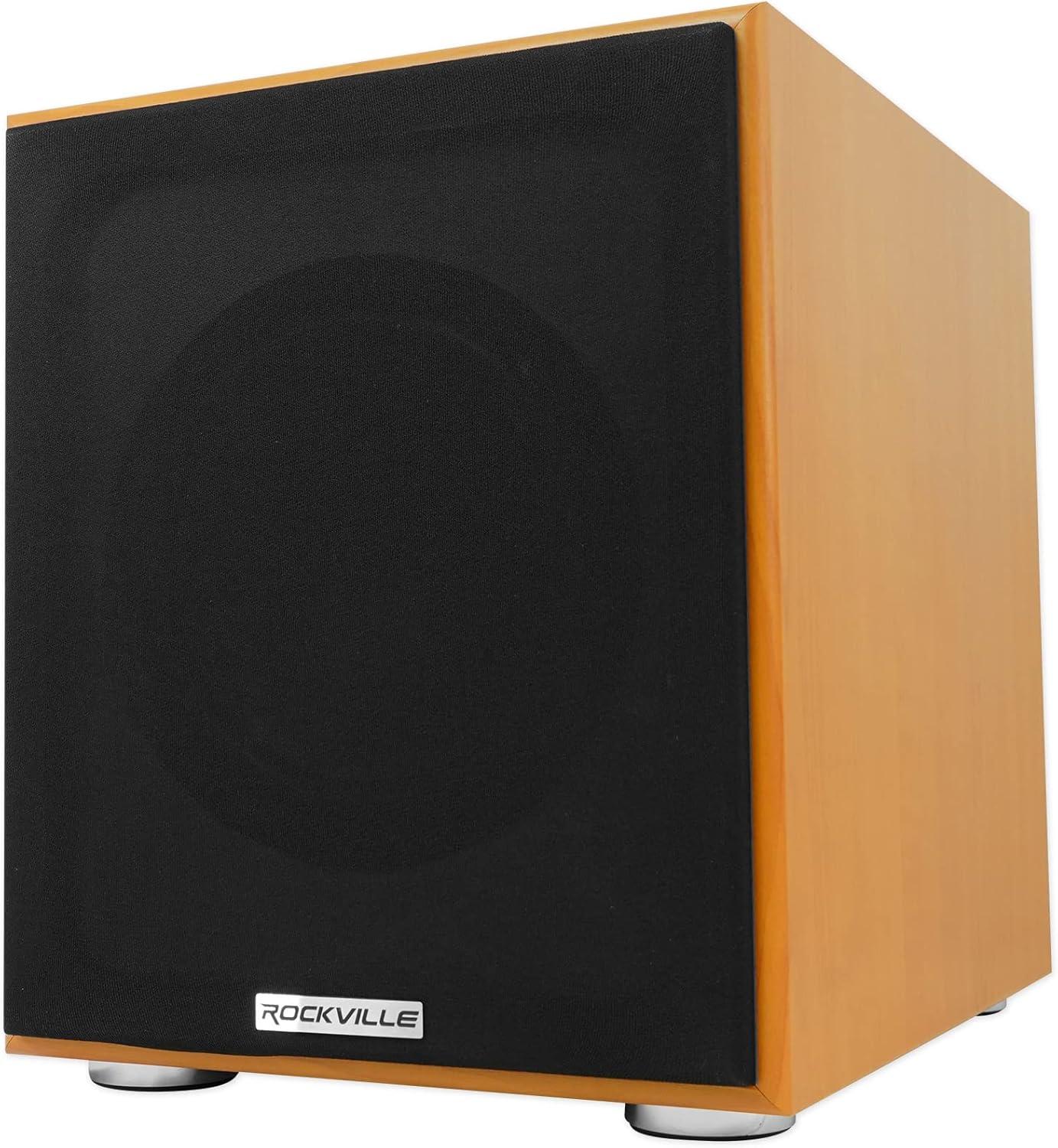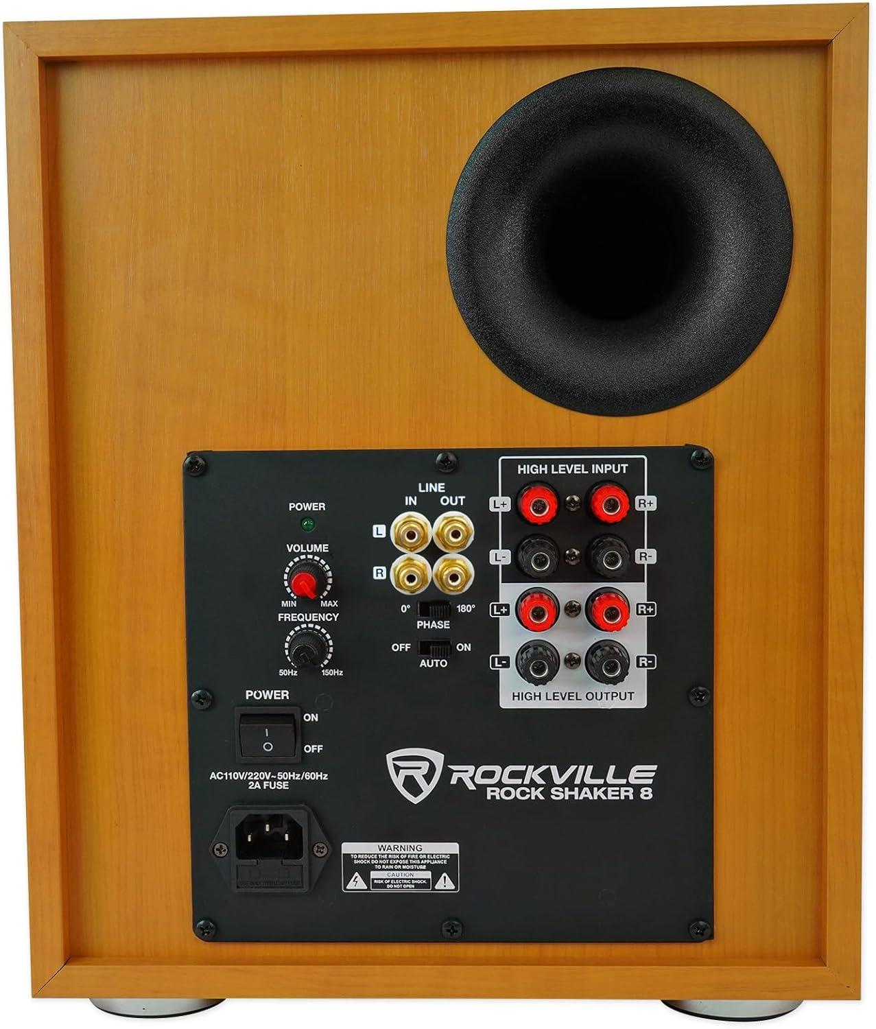 Output Impendence: 4-8ohm. Total Harmonic Distortion(THD): .02%. Signal-to-Noise Ratio(S/N): 6dB. Bluetooth: 2.1+EDR. USB : Supports WAV/MP3/WMA/APE/FLAC. 110V. Unit weight: 6.6 lbs. Unit dimensions: 10.6″x10.2″x5.1″. Features: RockvilIe Rock Shaker 8″ Classic Wood 400w Powered Home Theater Subwoofer Sub. 400 Watts Peak / 200 Watts RMS. Built-in Class D Amplifier. Enclosure is made of top quality MDF wood. (MDF wood sounds better and lasts longer than particle board)