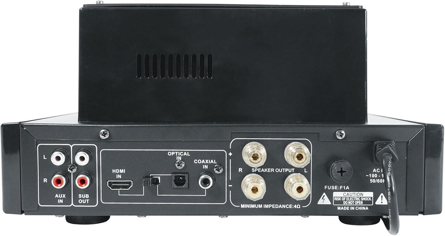 Due to this the amp sounds more like double the rated power!. Built in Bluetooth with 33 foot range. Built-in Preamplifier. Headphone output. VU meter. Adjustable bass and treble (2 band equalizer). USB input for music files from USB thumb drive. Rear Speaker Terminals: Banana plug / binding post outputs for 2 speakers. Frequency Response (±3dB): 22Hz-20kHz. Input Impedance: 47kO. Input Sensitivity: 300mV. Output Impendence: 4-8ohm.