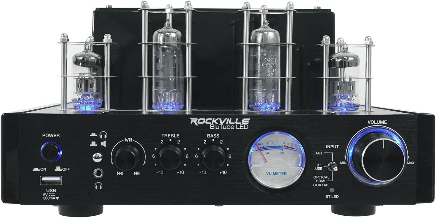 Includes of BluTubeLED: Tube Amplifier / Receiver. 5 Foot RCA to 3.5MM cable. 5.5 Foot Power cable. Owners manual / Warranty card. . . Rockville BluTubeLED Audiophile grade tube amplifier with Bluetooth. Black color with blue illuminated tubes and blue illuminated knobs. 25 watts x 2 RMS @ 8 ohm. 35 watts x 2 RMS @ 4 ohm. (1) set of RCA inputs to connect to any audio device like a TV, Laptop, or MP3 player, etc. Optical input. HDMI Input. Coaxial input. Sub output.