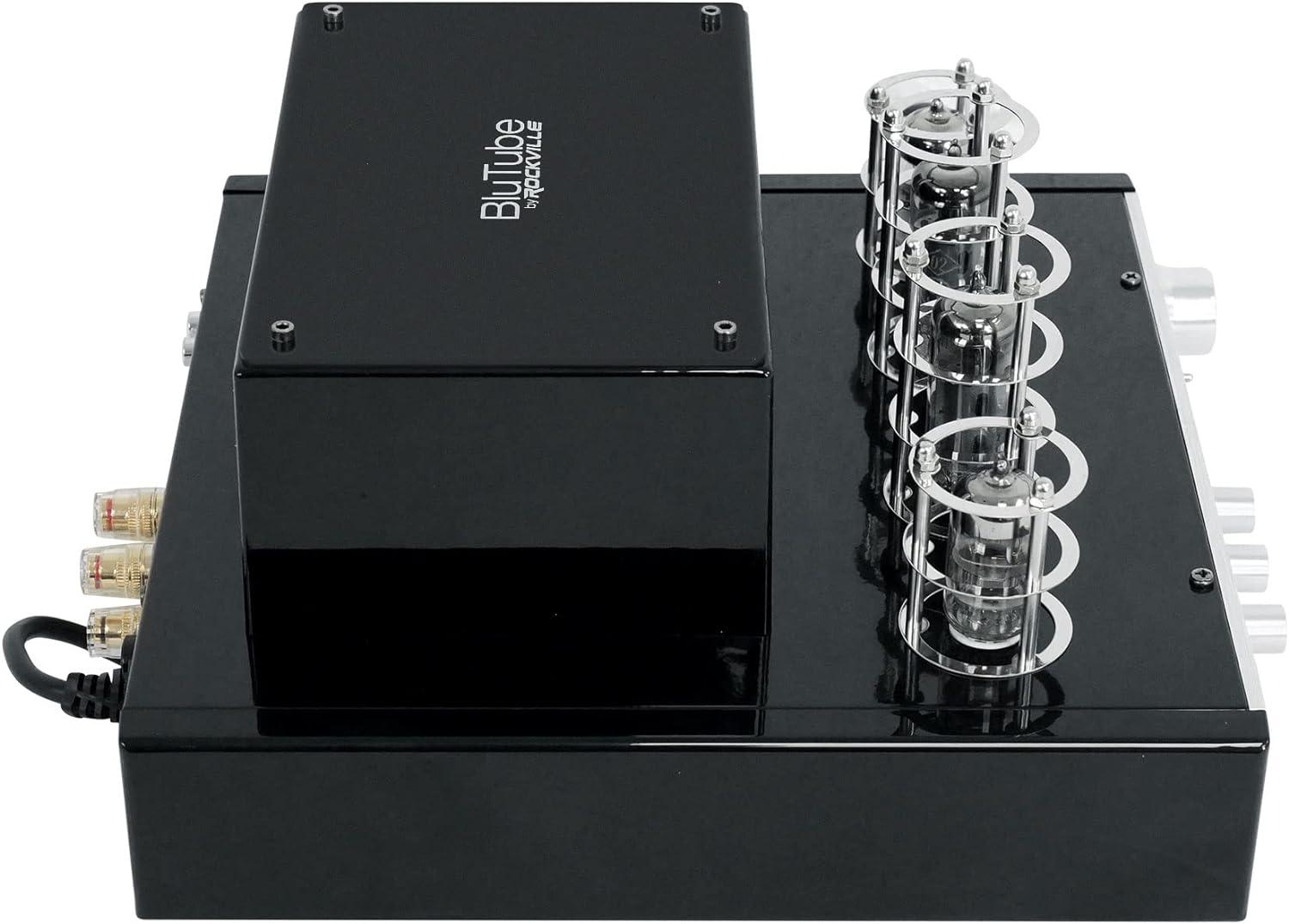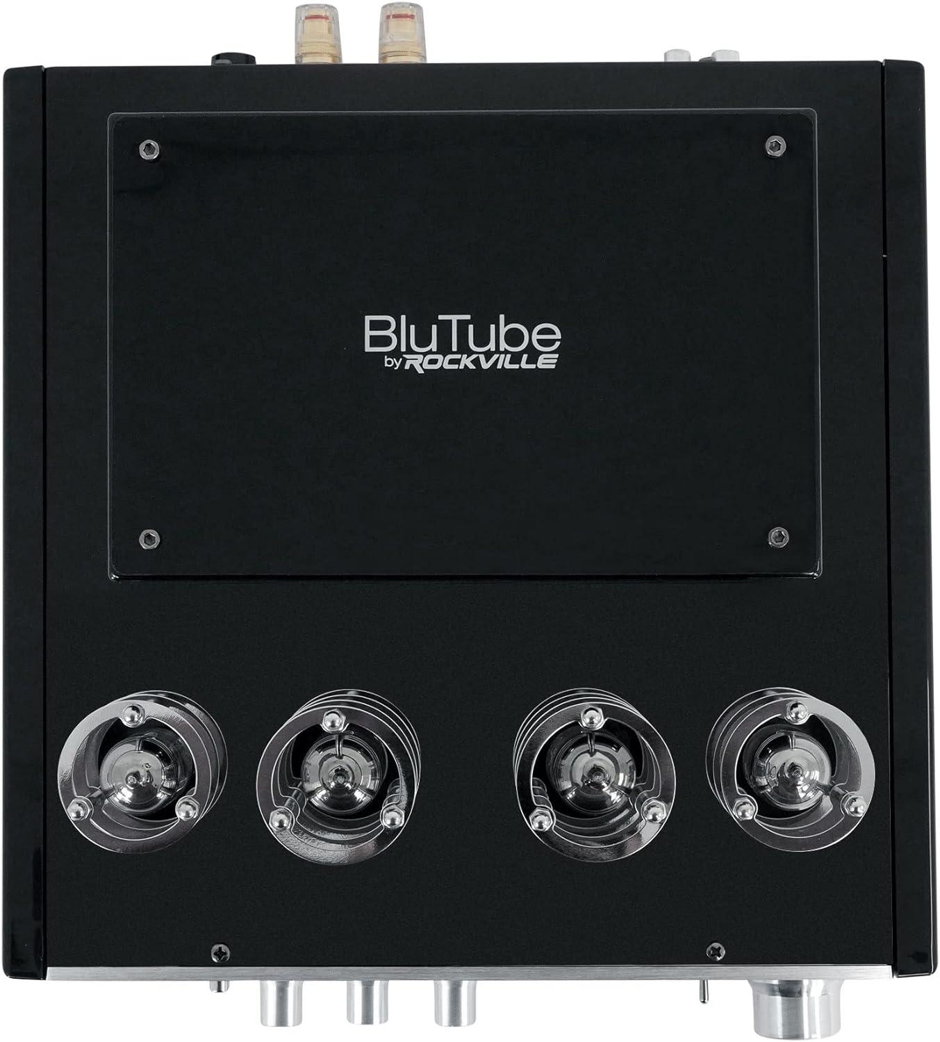 Includes of BluTube: Tube Amplifier / Receiver. 5 Foot RCA to 3.5MM cable. 5.5 Foot Power cable. Owners manual / Warranty card. Rockville BluTube Audiophile grade tube amplifier with bluetooth. 25 watts x 2 RMS @ 8 ohm. 35 watts x 2 RMS @ 4 ohm. Tube amps do not hard-clip even at high volumes and are extremely efficient. Due to this the amp sounds more like double the rated power!. Built in Bluetooth with 33 foot range. Built-in Preamplifier.