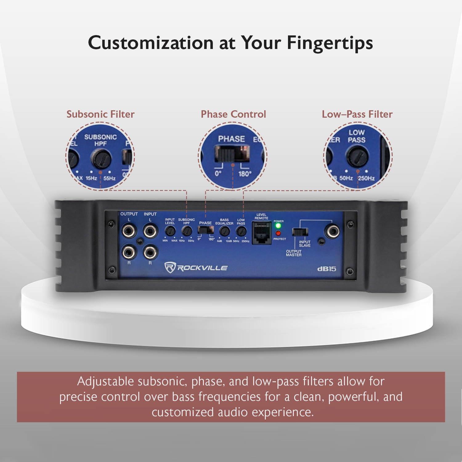 The dB15 is a mono amplifier with 6,000 watts peak output and 1500 watts Dyno-Certified power. Here at Rockville we offer the best value in car audio. We therefore want to make it easy for you to compare our products to any brands on the market. The peak rating can be used to compare with brands who use peak ratings such as Boss and Power Acoustik while the Dyno Certified RMS rating can be used to compare with top brands such as Kicker, Rockford, Alpine, etc. One of the tricks to determine the real power of a car amplifier is to multiply the fuse rating by 10 to determine the true RMS power. This formula almost always works within 20 %. The dB15 features a fuse with a rating of 150 Amps. Although we rate these conservatively at 1500 watts Dyno Certified @ 2 ohms, this amplifier puts out more power than this!. This amp has a fully adjustable 12dB/Octave crossover with differential circuitry. Other features include a subsonic filter, a fully adjustable bass equalizer, mute and delay soft start technology, a phase control switch, and a dashboard subwoofer control for added convenience..