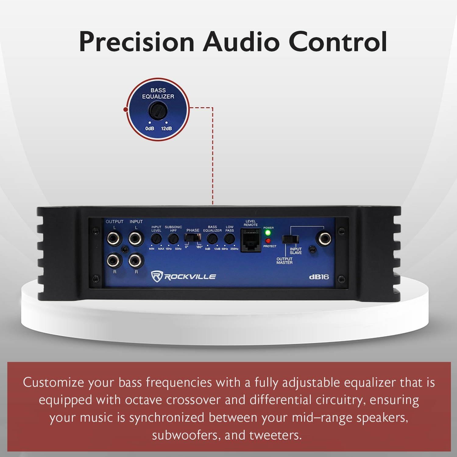 Advanced Sound Control: Features fully adjustable 12dB/octave crossover, subsonic filter (15Hz-55Hz), and 12dB bass equalizer for precise audio tuning.