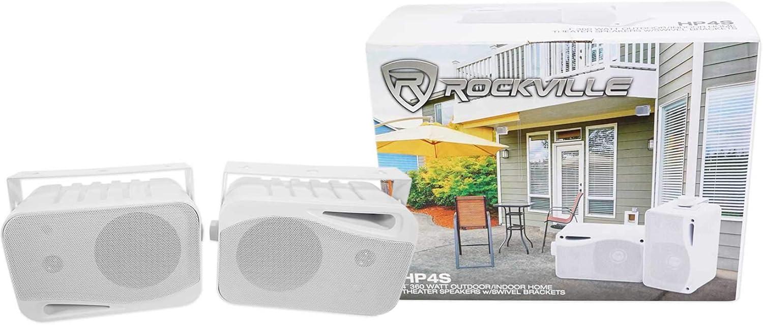 Package Includes: (2) Pairs of Rockville HP4S 4″ Outdoor/Indoor Home Theater Speakers with Swivel Bracket. Complete solution for indoor or outdoor audio, featuring heavy-duty ABS construction, IPX44 weather resistance, swiveling brackets, and removable rustproof grills for flexible placement in patios, backyards, gyms, hotels, and commercial spaces.