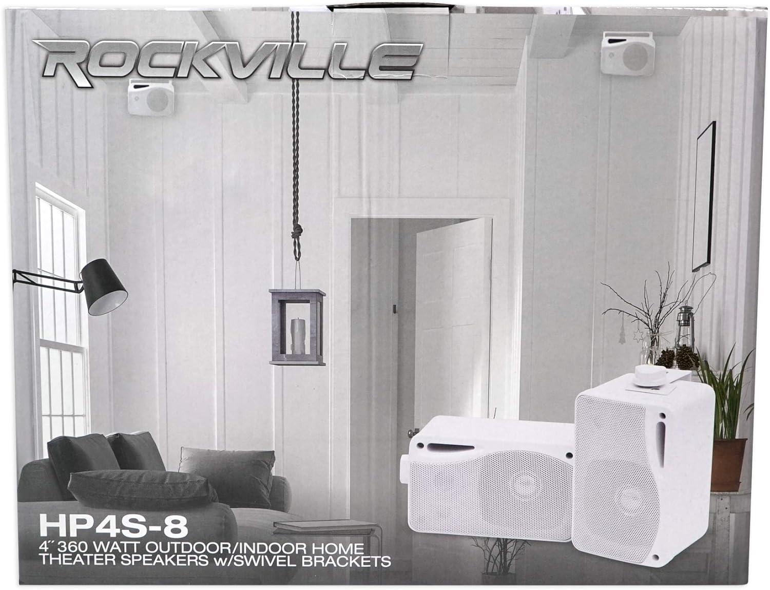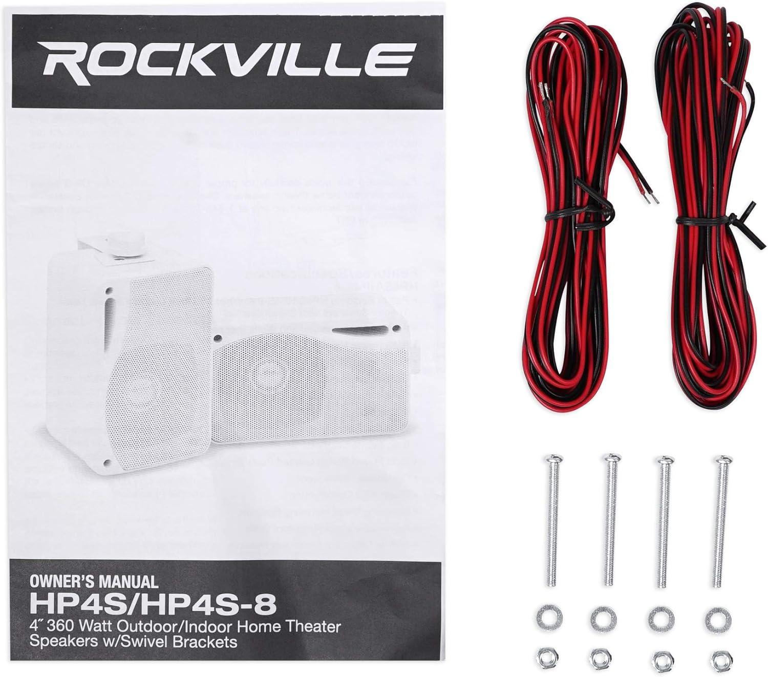 Package Includes: (4) Pairs of Rockville HP4S-8 4″ White 360W Outdoor/Indoor Home Theater Speakers with Swivel Brackets, (4) Owner's Manuals.