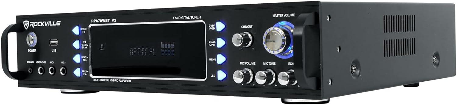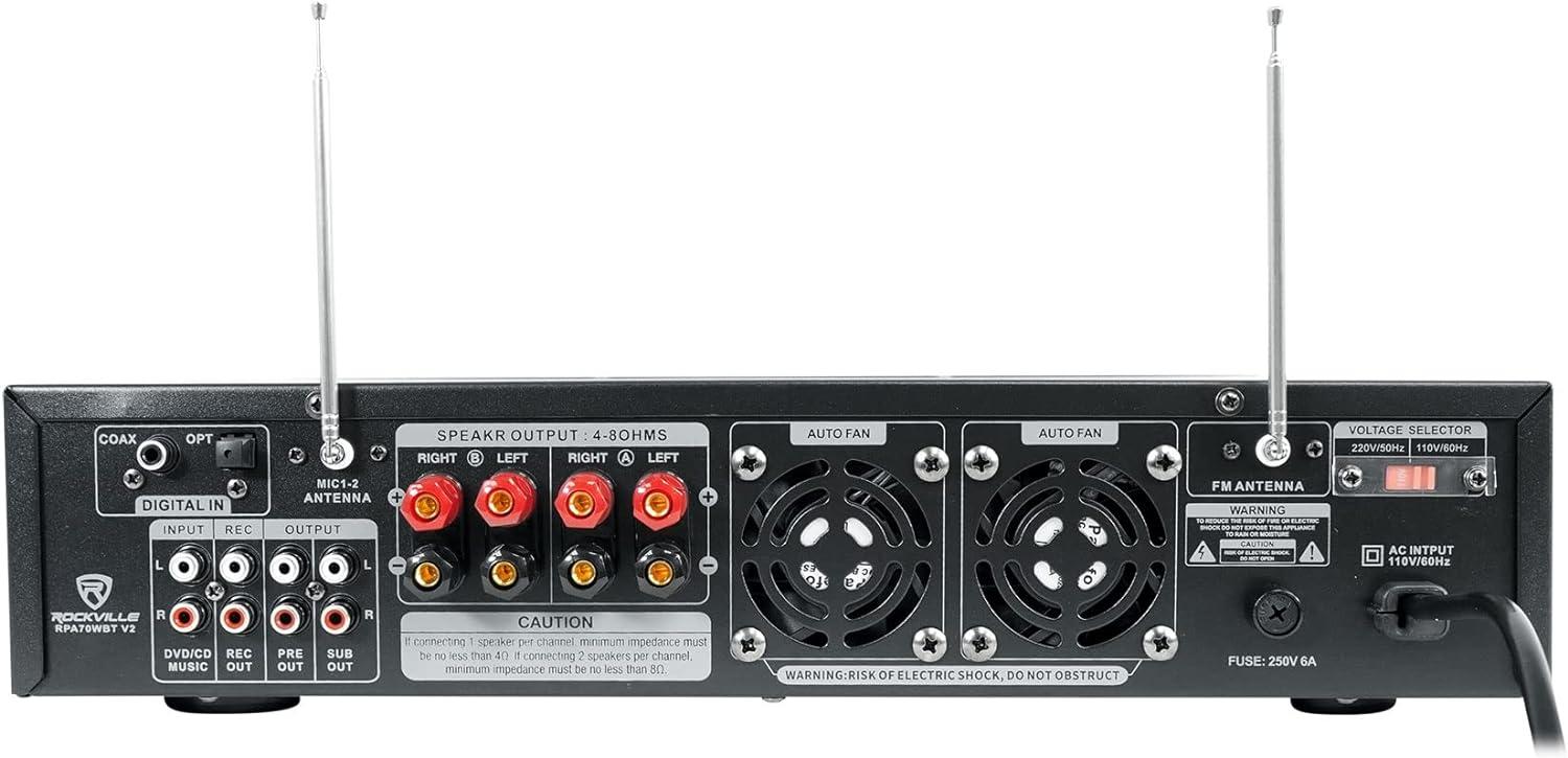 Features of RPA70WBT: RockvilIe RPA70WBT 1000 Watt 2-Channel Pro/Karaoke Amplifier/Mixer with (2) Wireless Microphones and USB + Bluetooth, RMS Power @ 4 Ohms: 125 Watts x 2, Peak Power @ 4 Ohms: 500 Watts x 2, RMS Power @ 8 Ohms: 100 Watts x 2, Peak Power @ 8 Ohms: 400 Watts x 2, THD: > 0.1%, Input Sensitivity: 400mv/33 KOhm, Frequency Response: 20 Hz – 20 kHz, Signal to Noise Ratio: 80 dB, Tone Characteristic: 100 Hz – 10 kHz +/-12dB, 110v/220v switchable